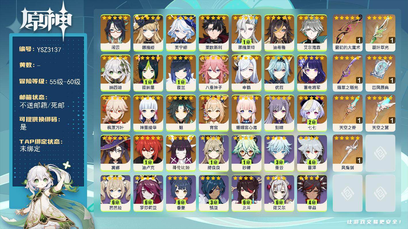 55级/16黄/女主/13个五星角色/1个五星武器/纳西妲/温迪/申鹤