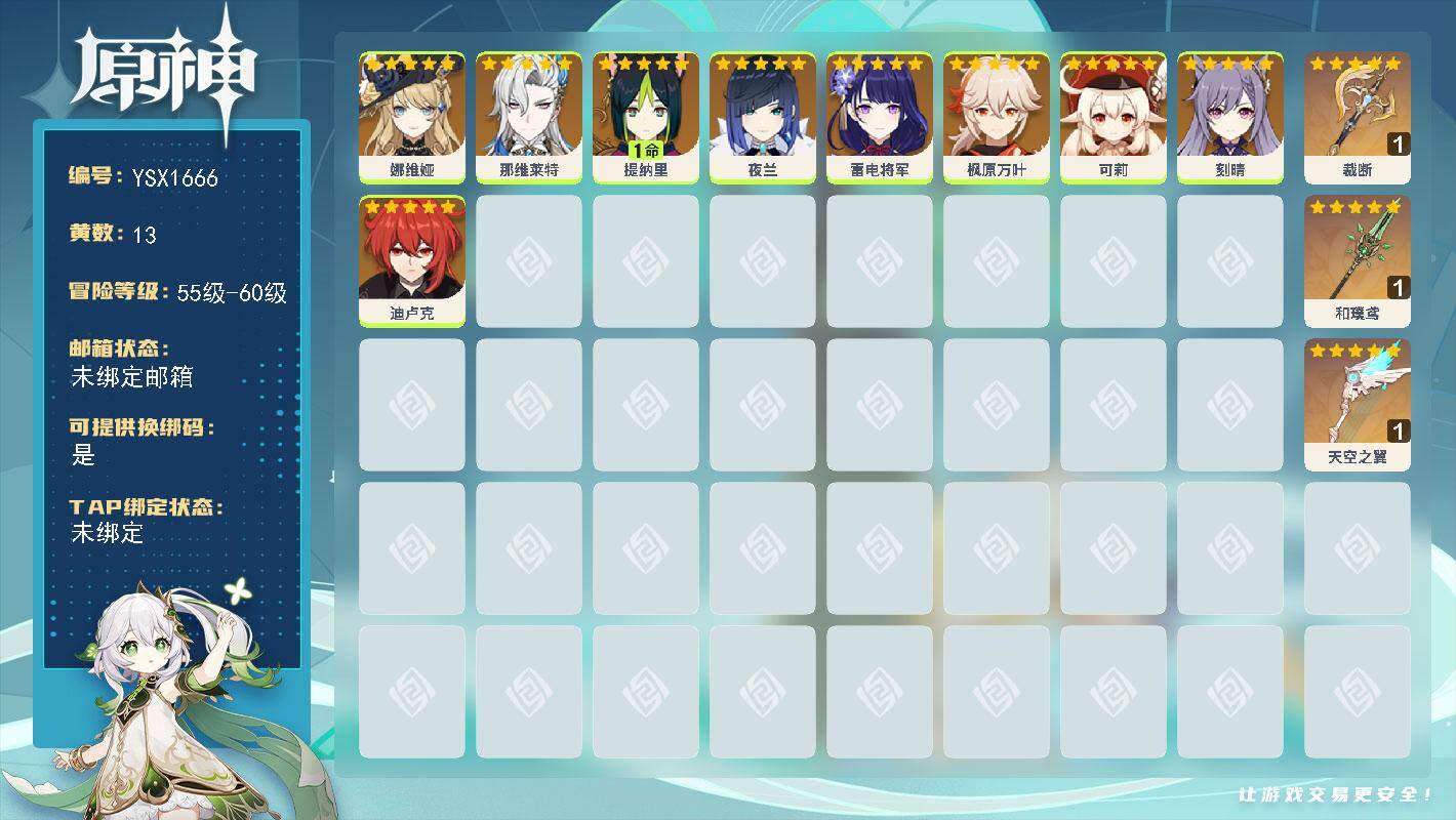 56级/13黄/女主/9个五星角色/3个五星武器/那维莱特/娜维娅/1命提纳里