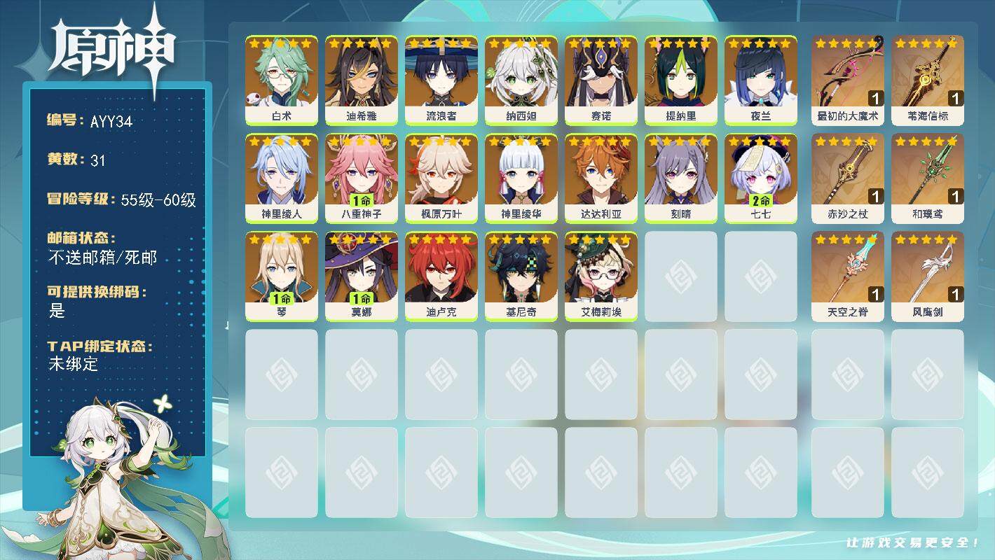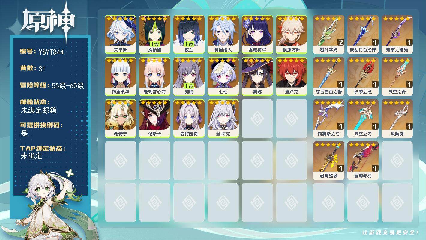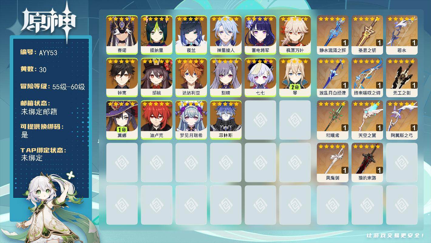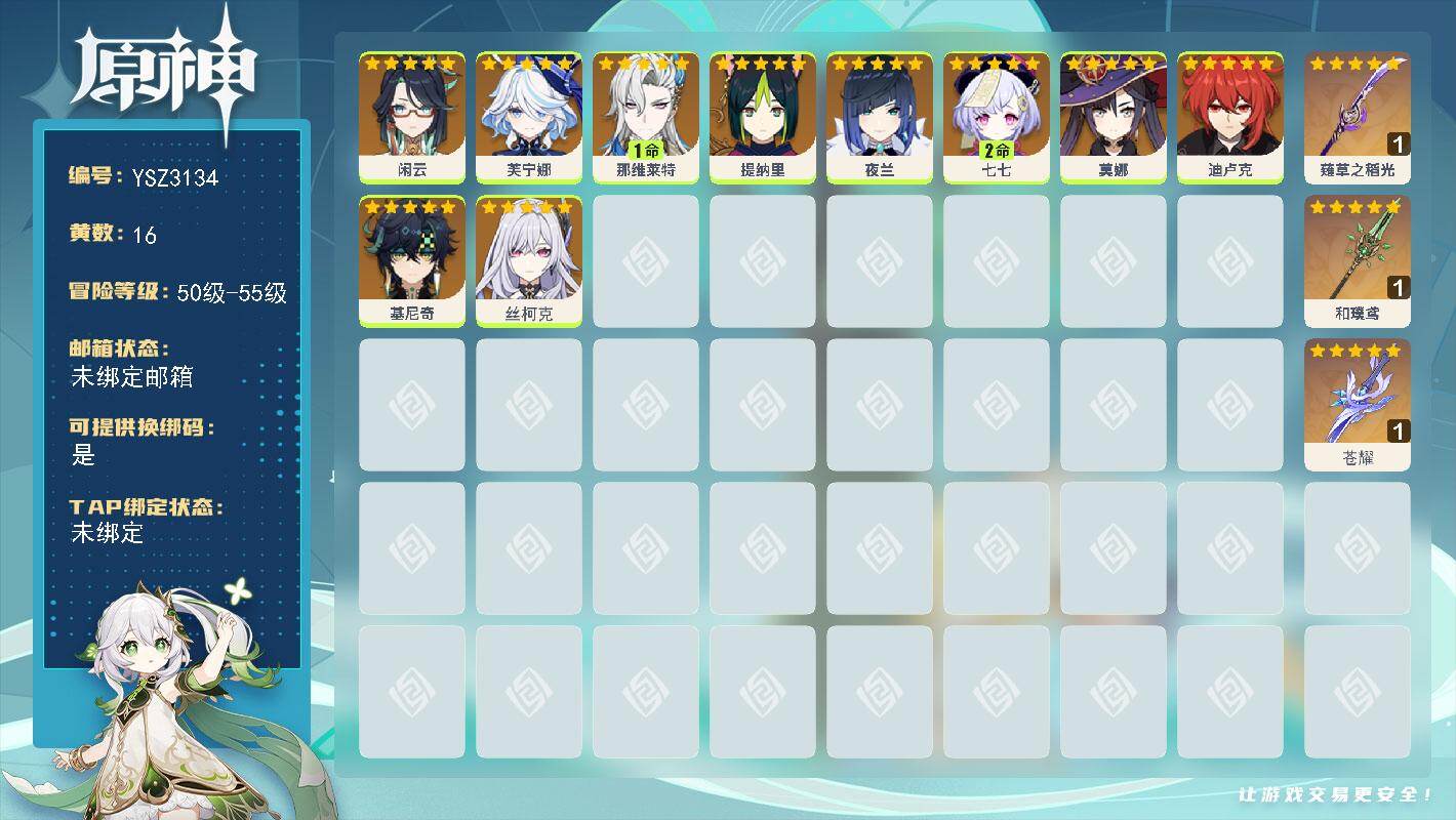 56级/30黄/女主/16个五星角色/11个五星武器0命赛诺,0命提纳里,0
