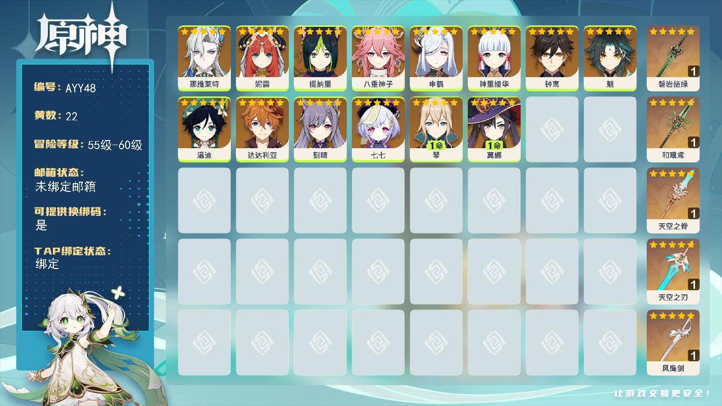 56级/18黄/女主/14个五星角色/2个五星武器/0命丝柯克/纳西妲/那维莱特