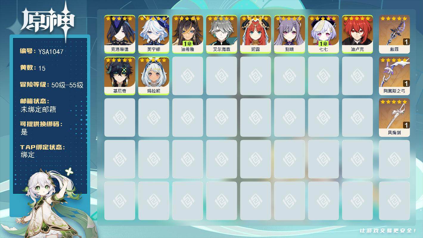 55级/15黄/女主/10个五星角色/3个五星武器/克洛琳德/妮露/