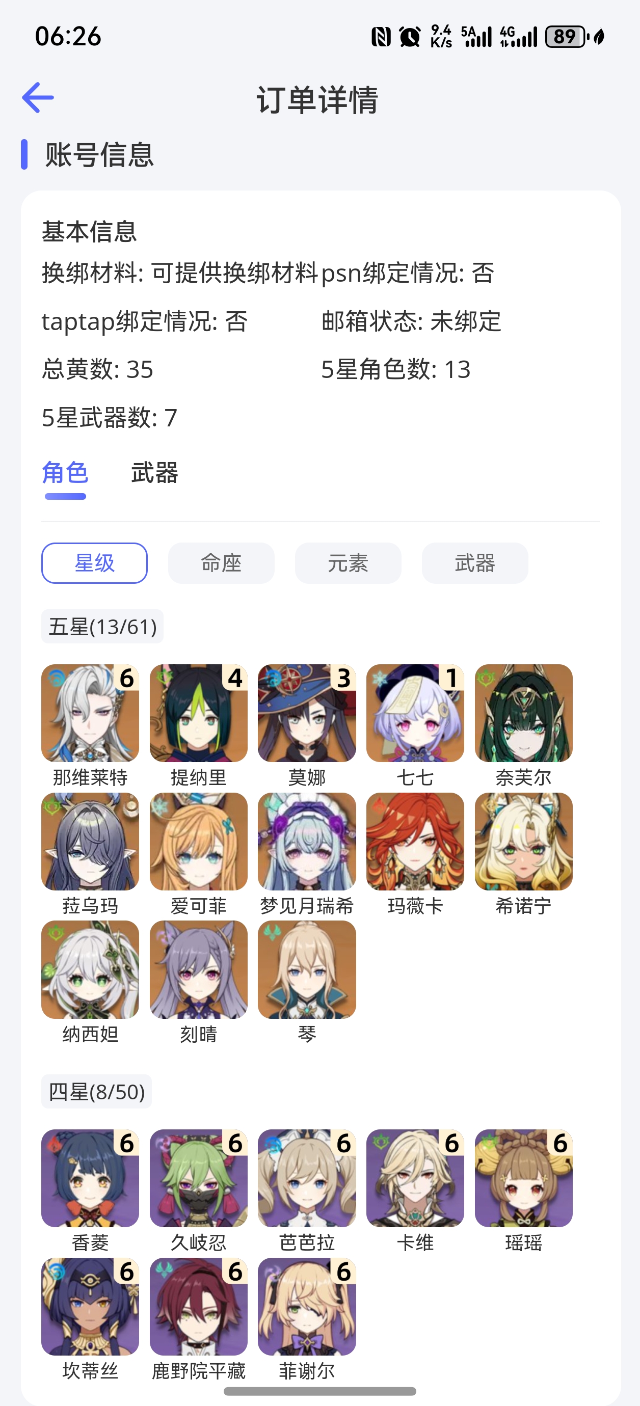 58级/42黄/男主/21个五星角色/8个五星武器0命闲云,0命那维莱特,0
