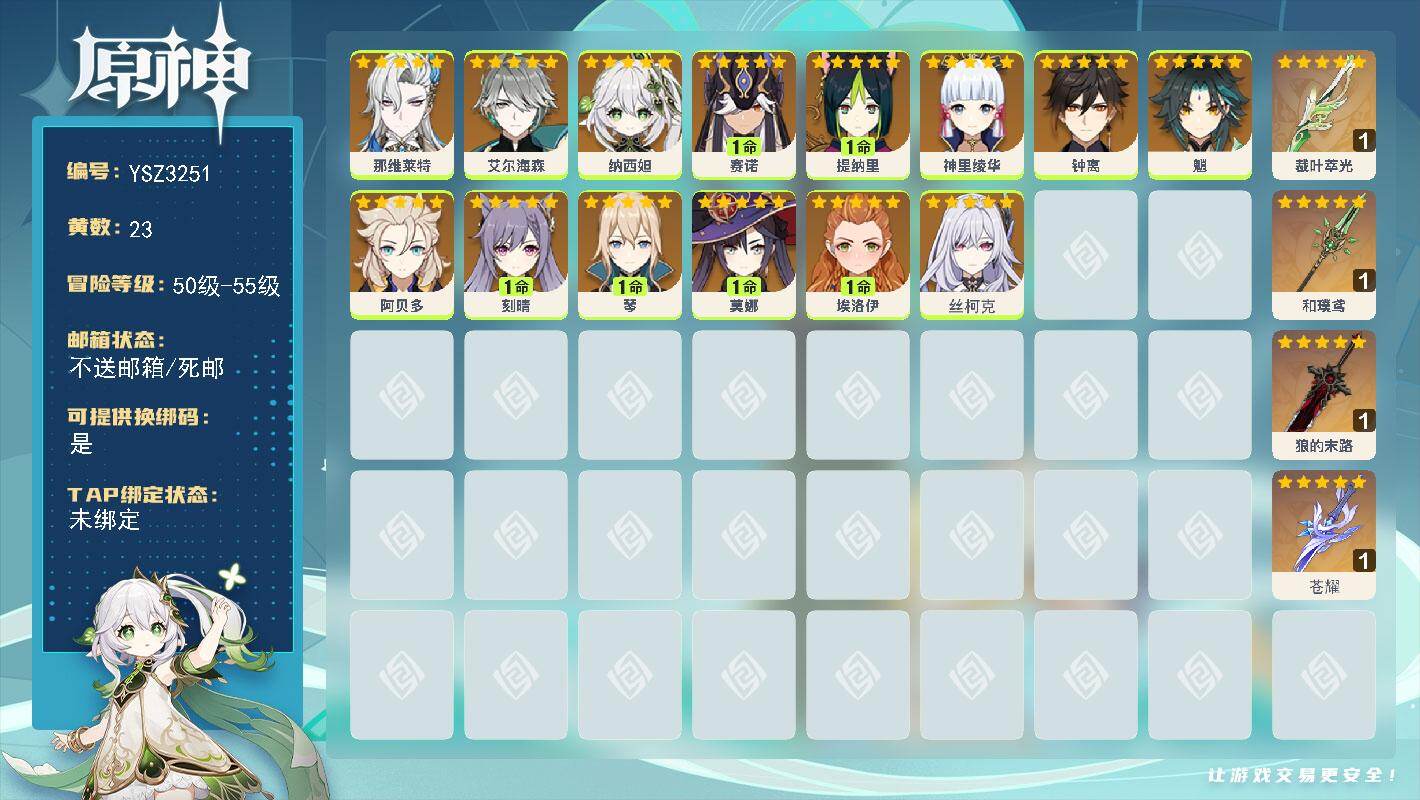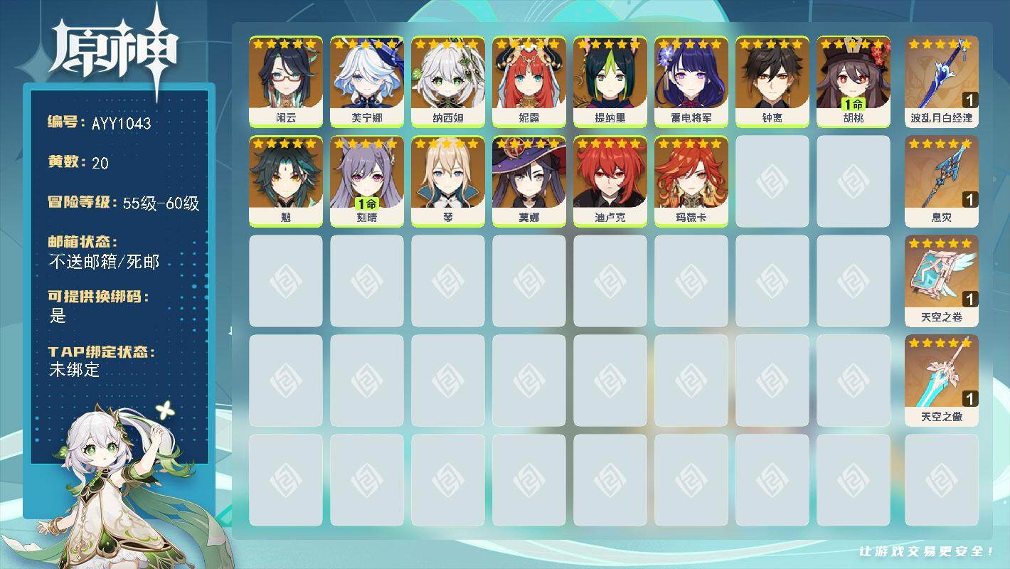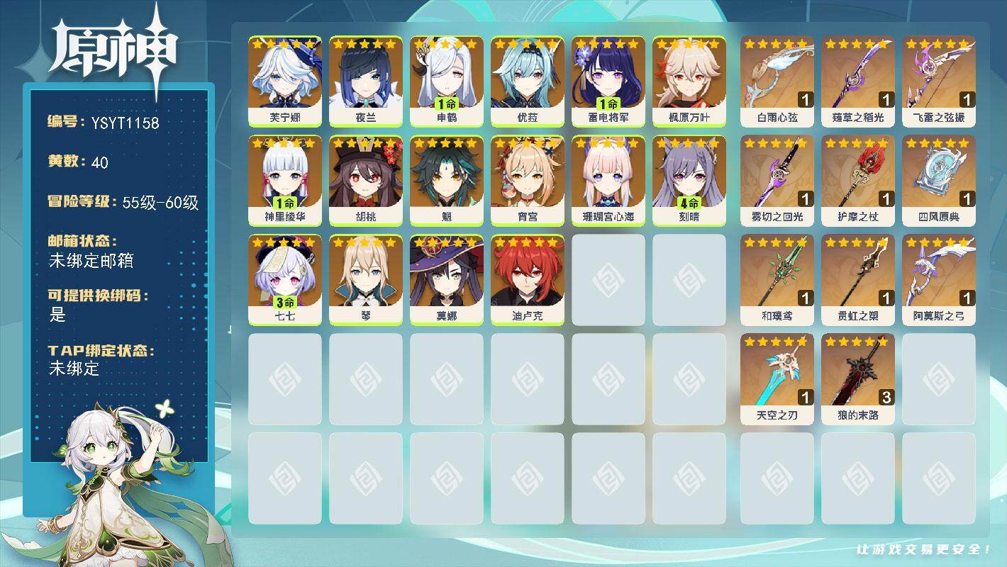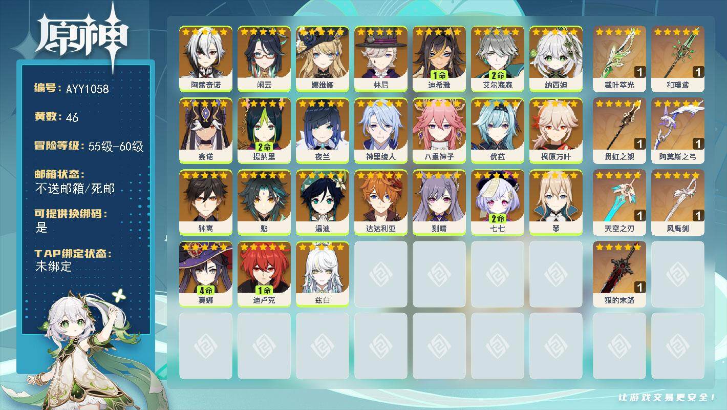 56级/20黄/男主/14个五星角色/4个五星武器0命闲云,0命芙宁娜,0命纳西妲