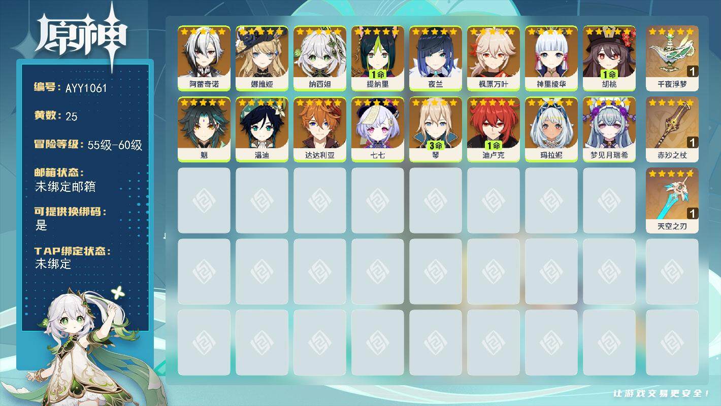 58级/36黄/女主/16个五星角色/11个五星武器1命提纳里,0命夜兰,0命雷电