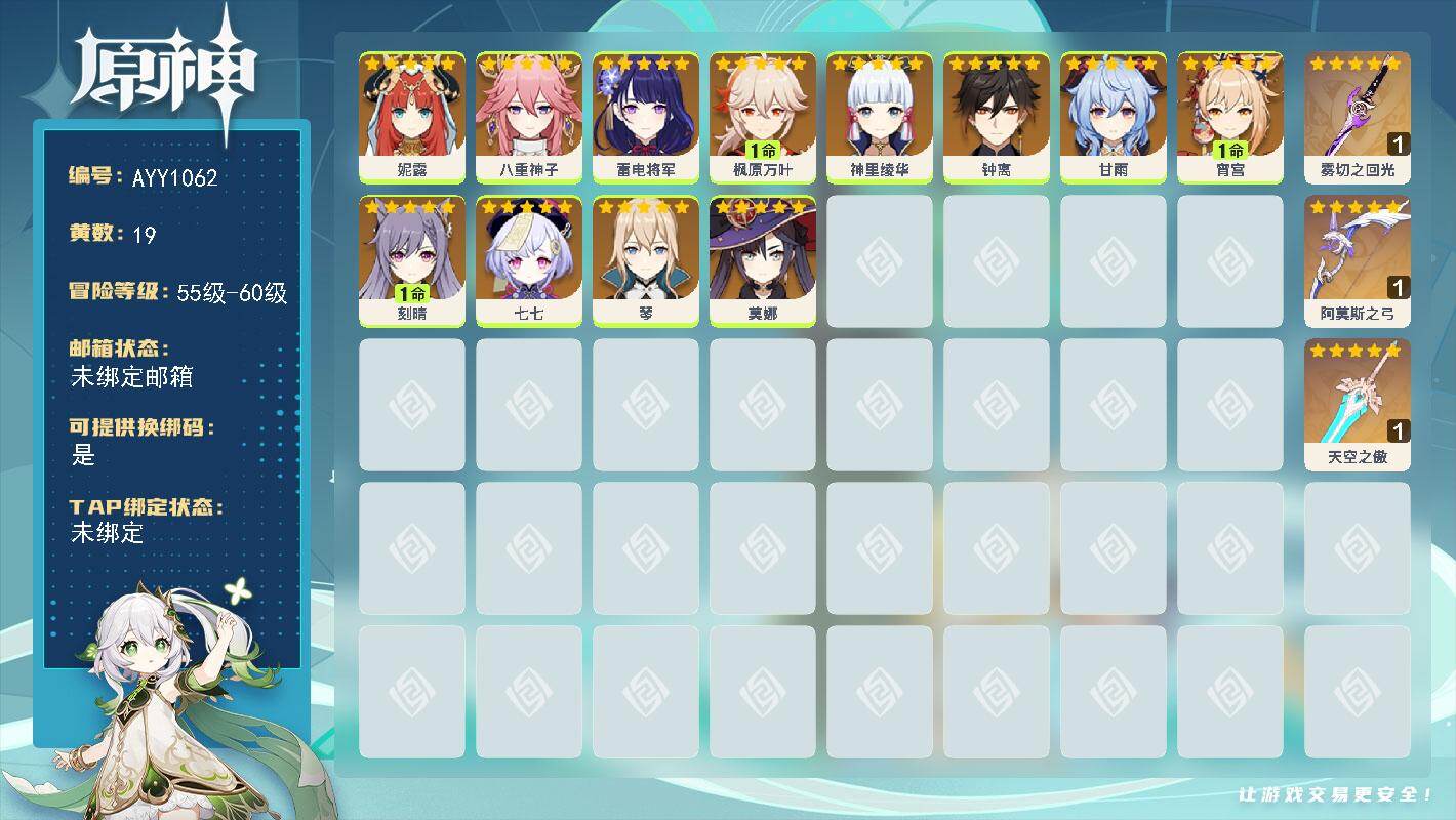 56级/19黄/女主/12个五星角色/4个五星武器0命妮露,0命八重神子,0