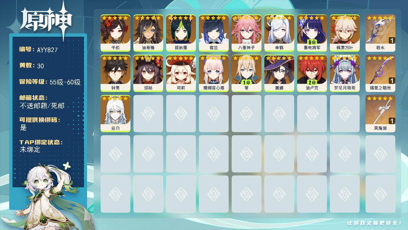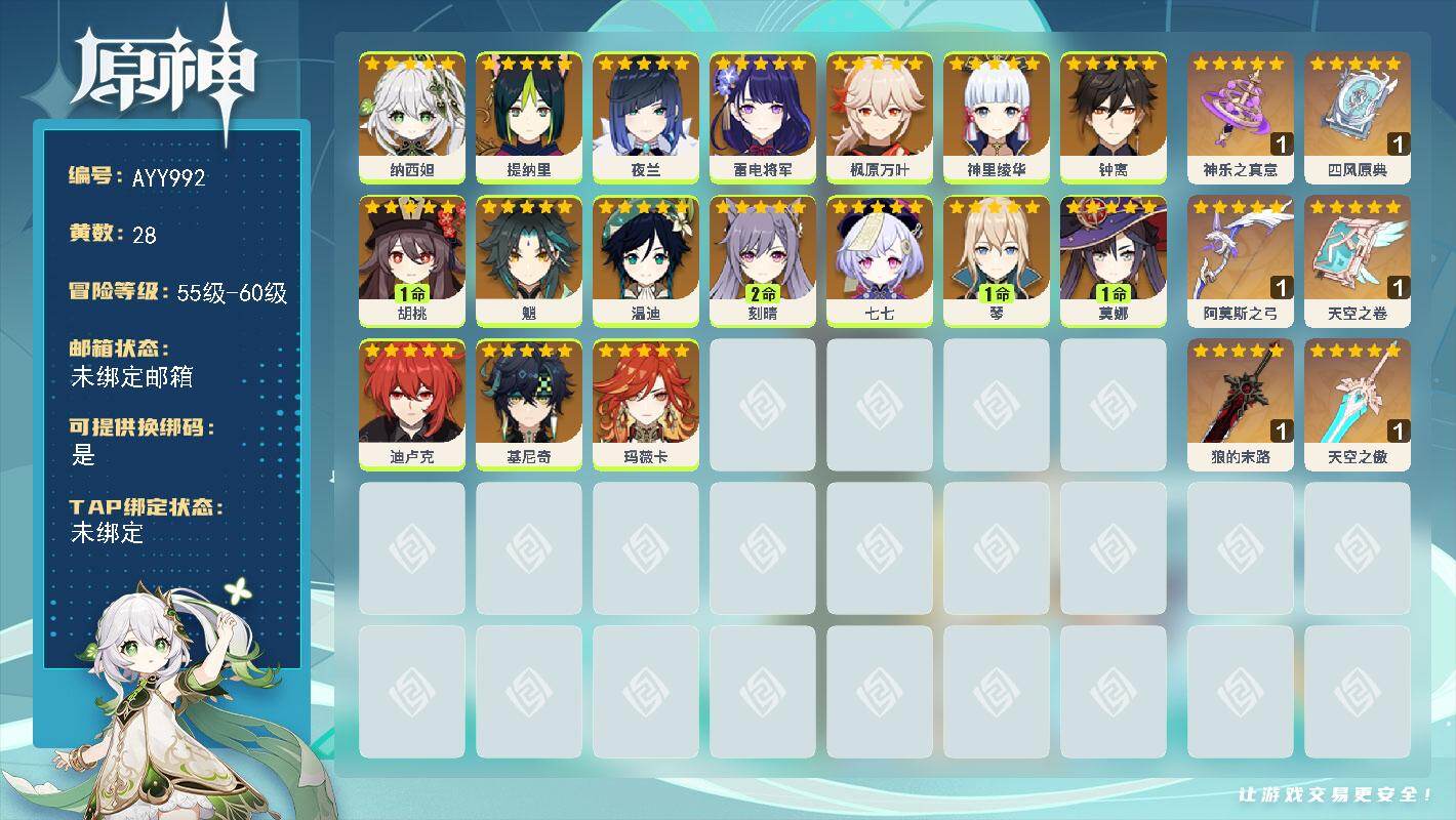 58级/28黄/女主/17个五星角色/6个五星武器0命纳西妲,0命提纳里,0命夜兰