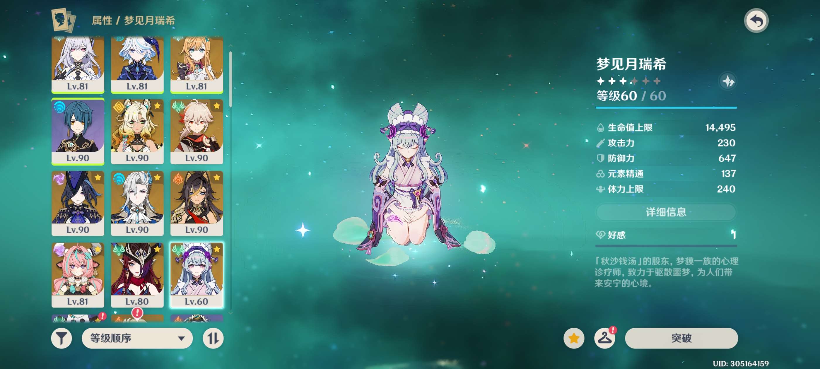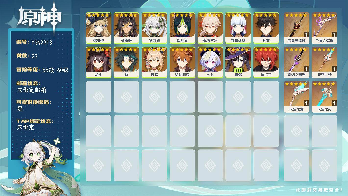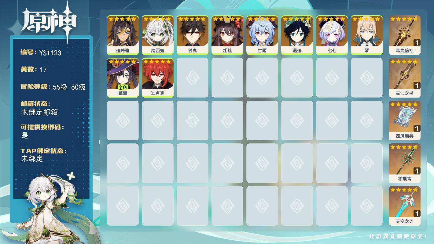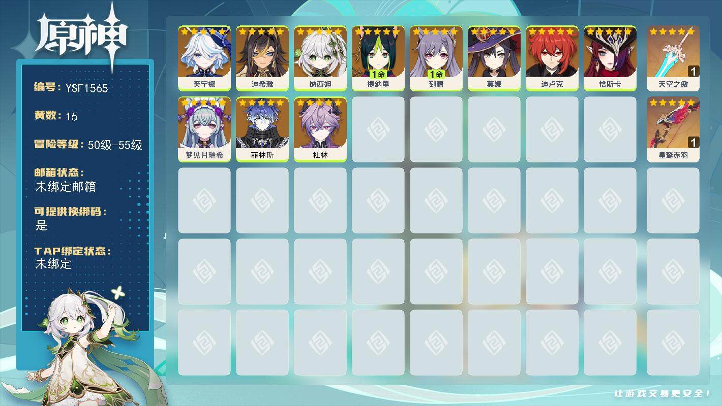 55级/15黄/女主/11个五星角色/2个五星武器/恰斯卡/芙宁娜/0命杜林