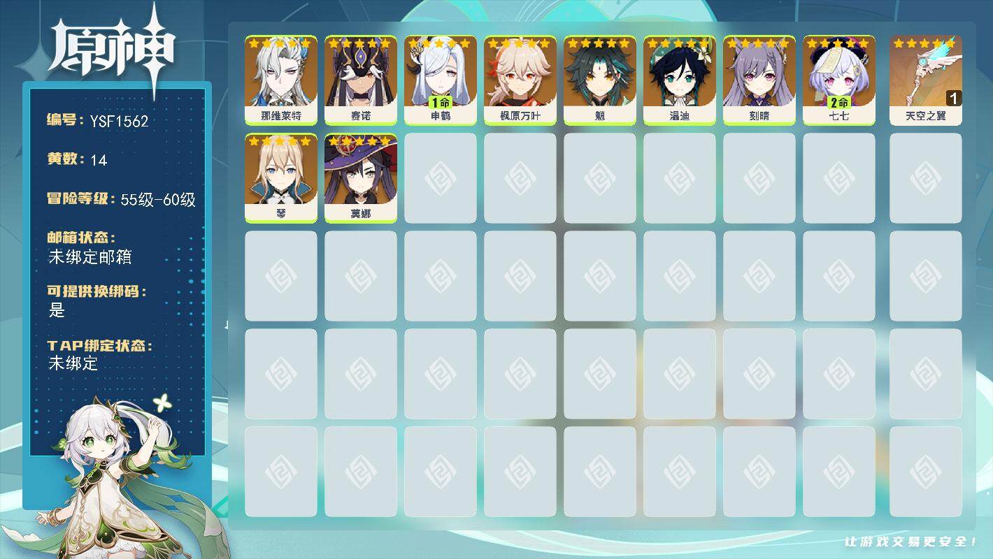 56级/14黄/女主/10个五星角色/1个五星武器/枫原万叶/魈/那维莱特