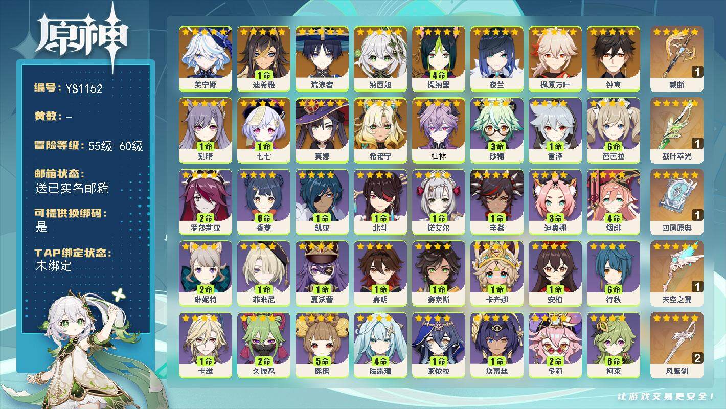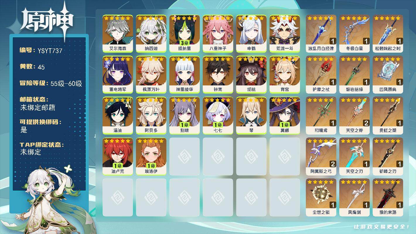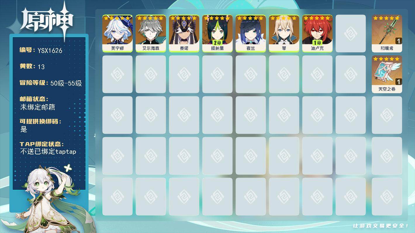 55级/13黄/女主/7个五星角色/3个五星武器/夜兰/芙宁娜/艾尔海森
