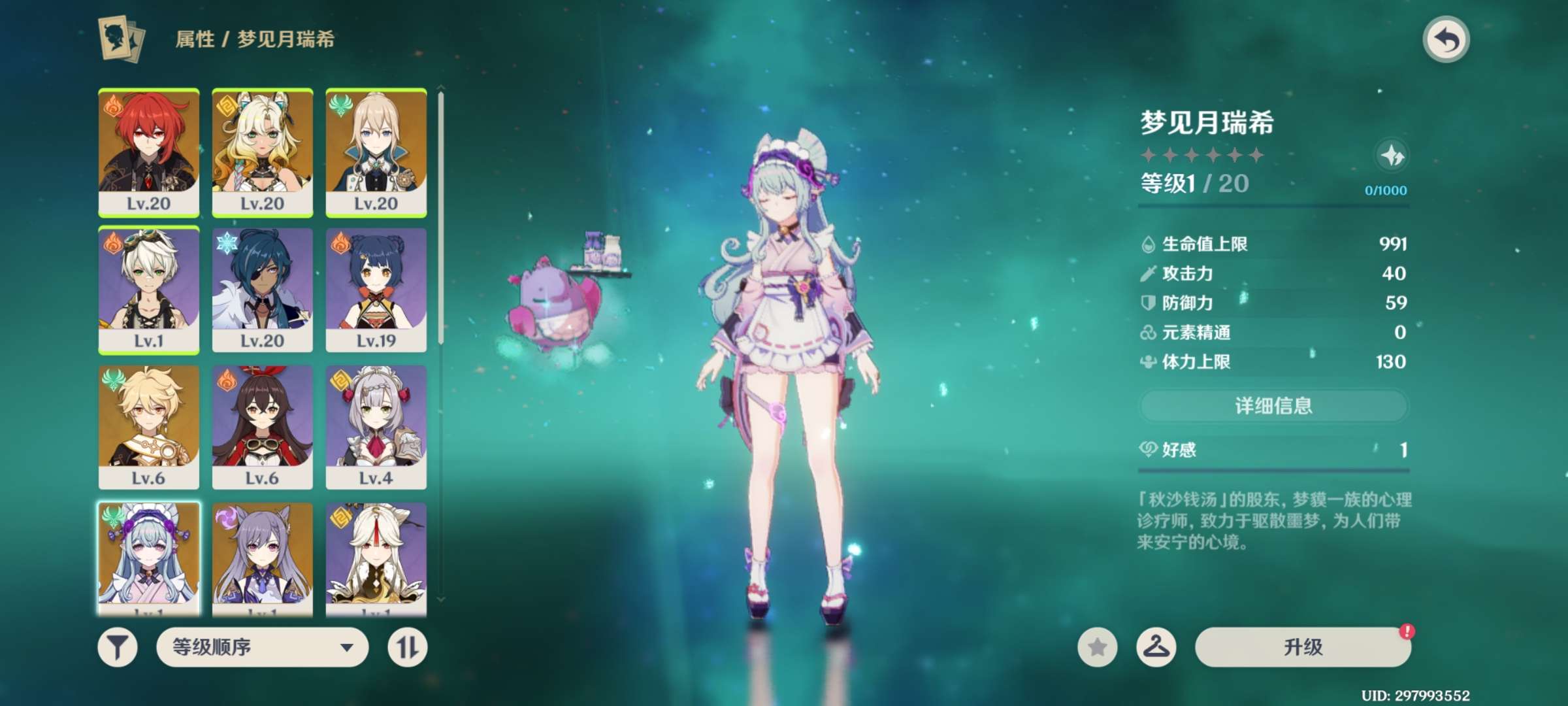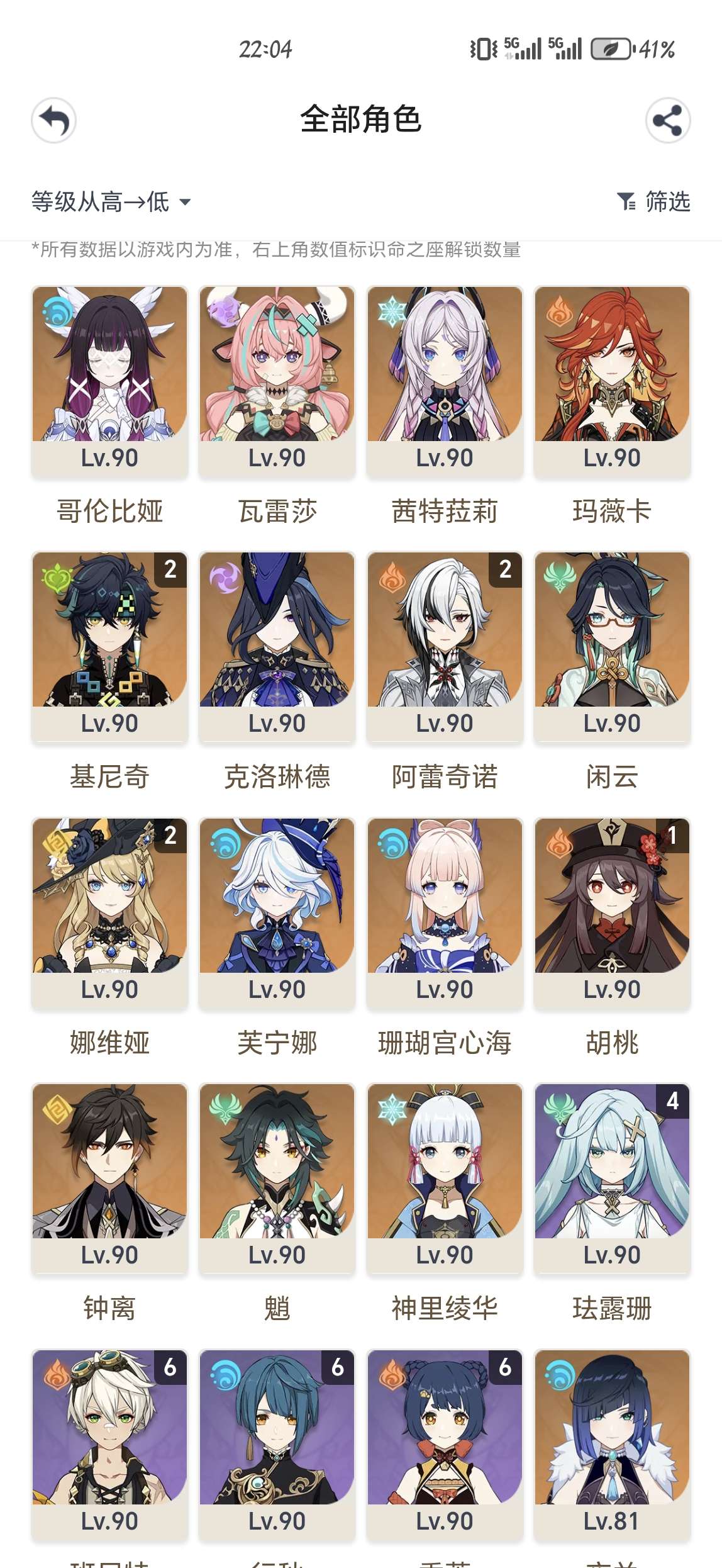 57级/33黄/女主/21个五星角色/5个五星武器/1命优菈/钟离