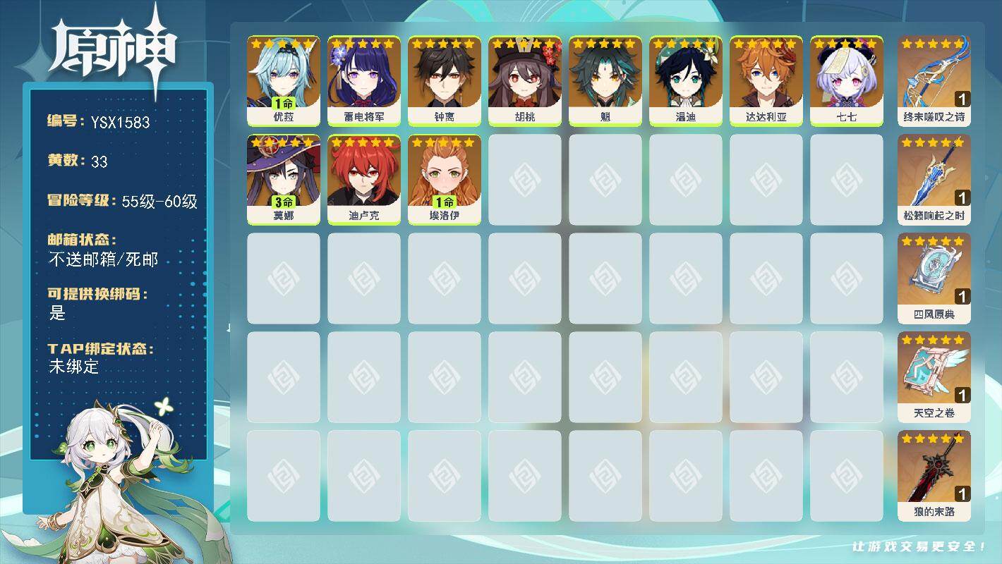 YSX158755级/9黄/女主/8个五星角色/1个五星武器/莱欧斯利/八重神子