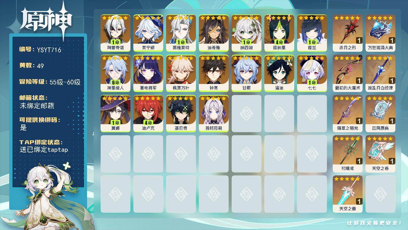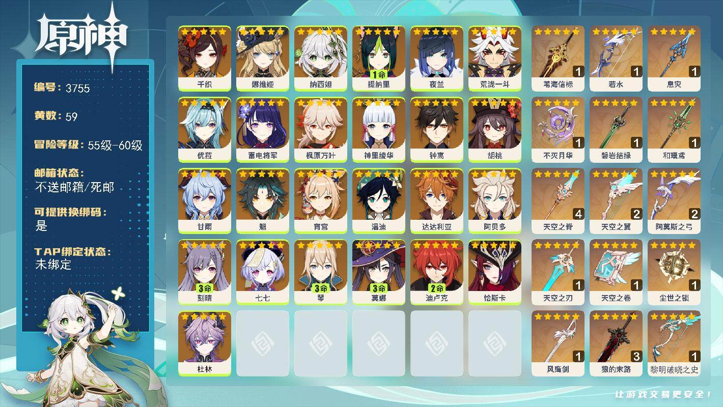60级/59黄/女主/25个五星角色/15个五星武器0命千织,0命娜维娅,0