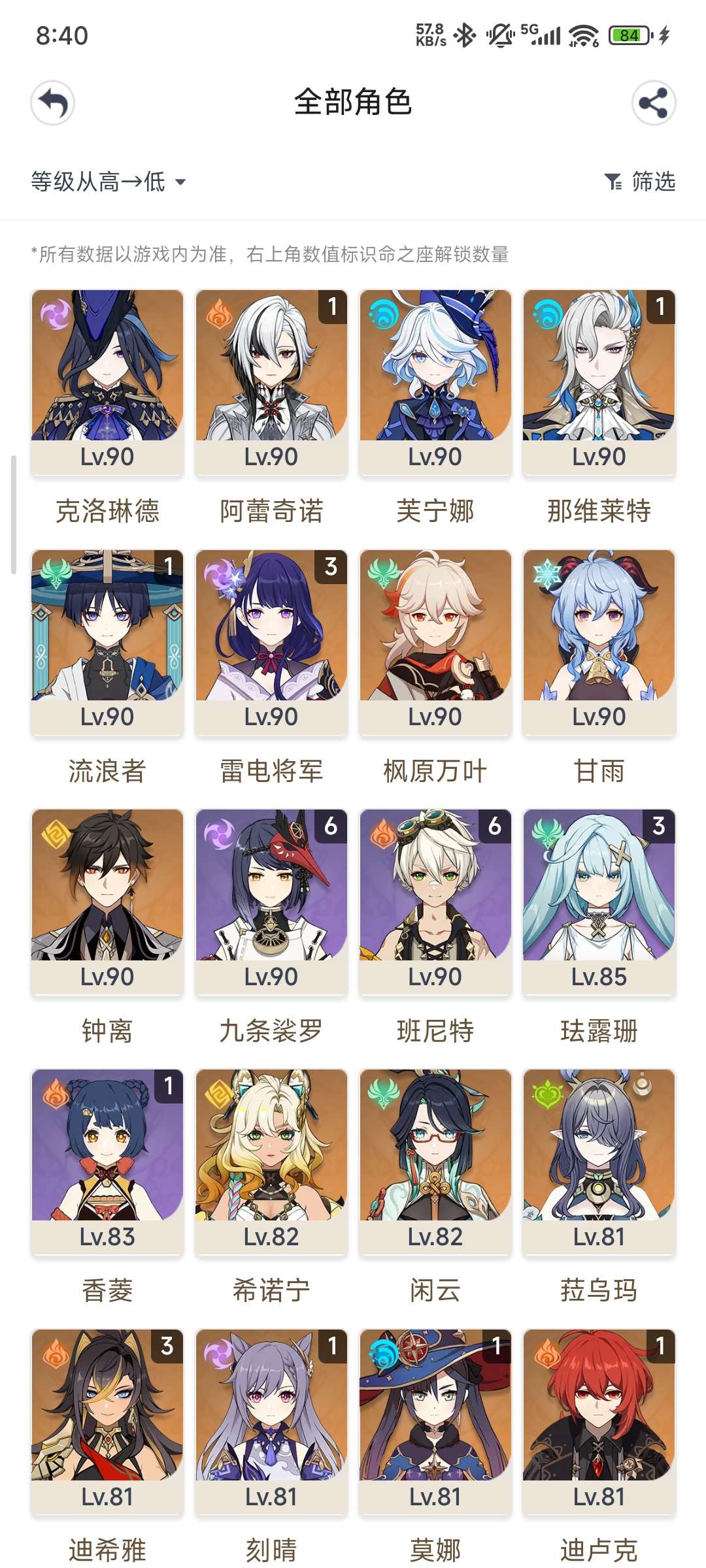 60级/53黄/男主/27个五星角色/13个五星武器0命克洛琳德,0命阿蕾奇