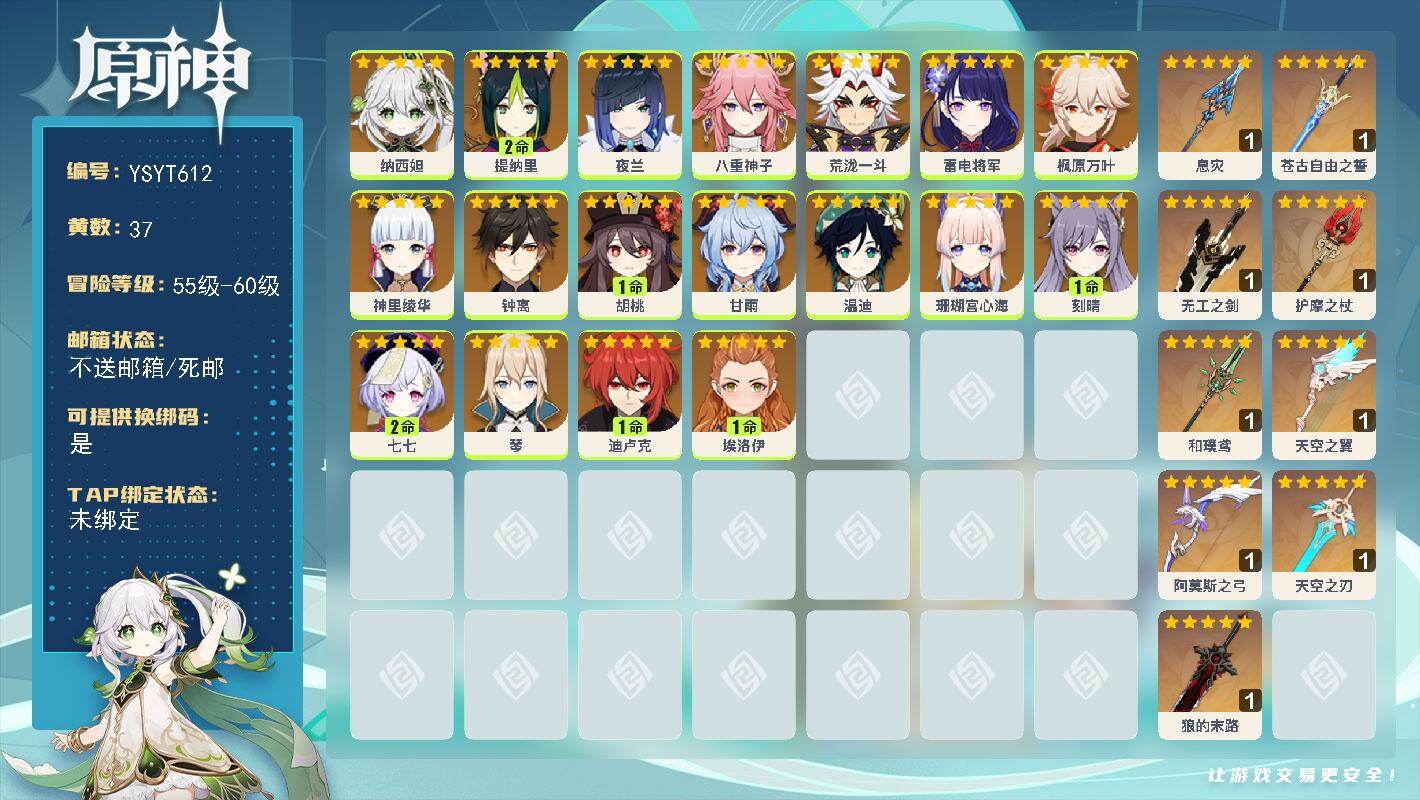 59级/37黄/女主/18个五星角色/12个五星武器/