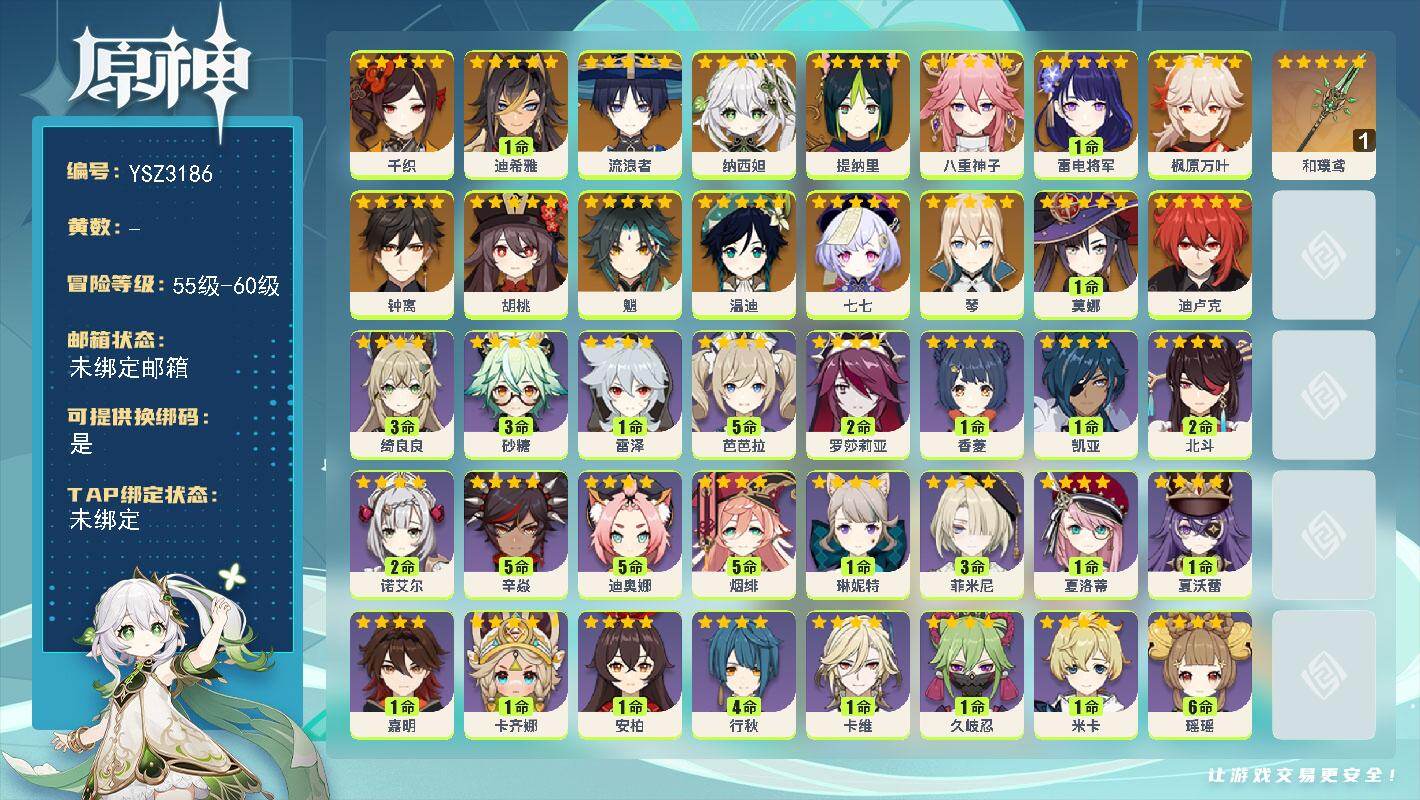 官服48金,2命菲林斯,2+1夜兰,1+1胡桃,万叶,绫华,神子,申鹤,风神,岩神,雷神,草神等