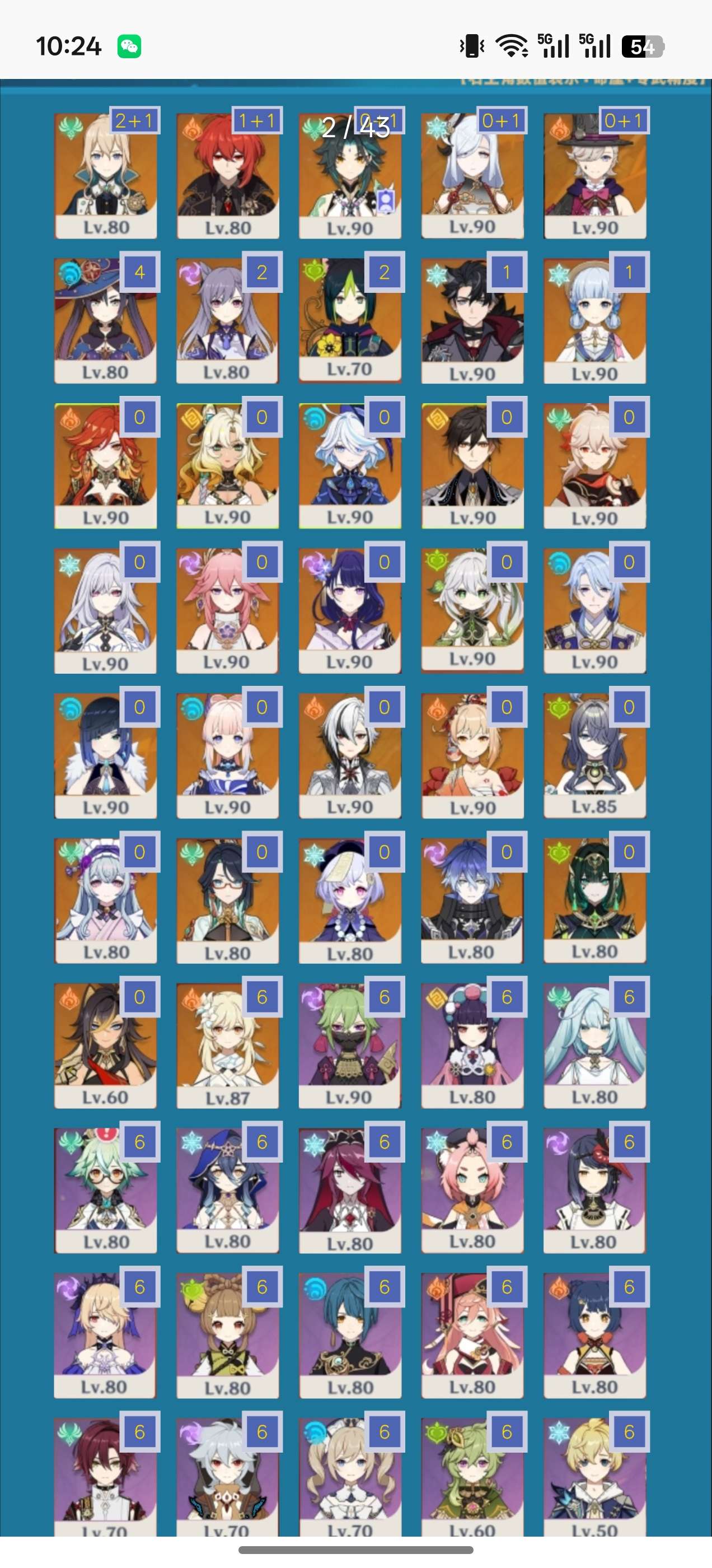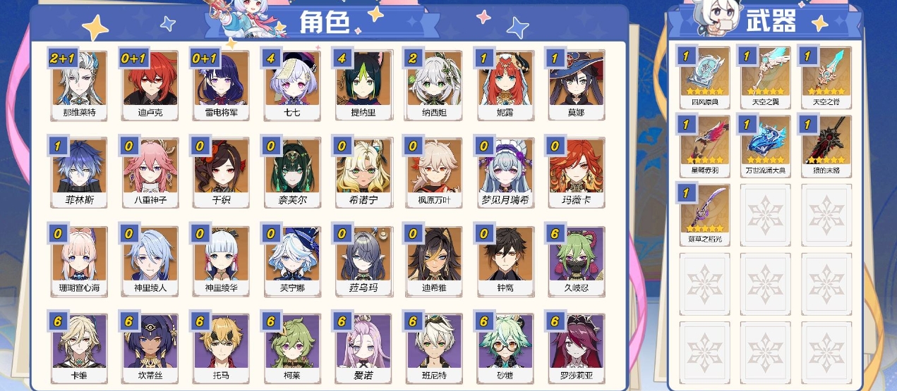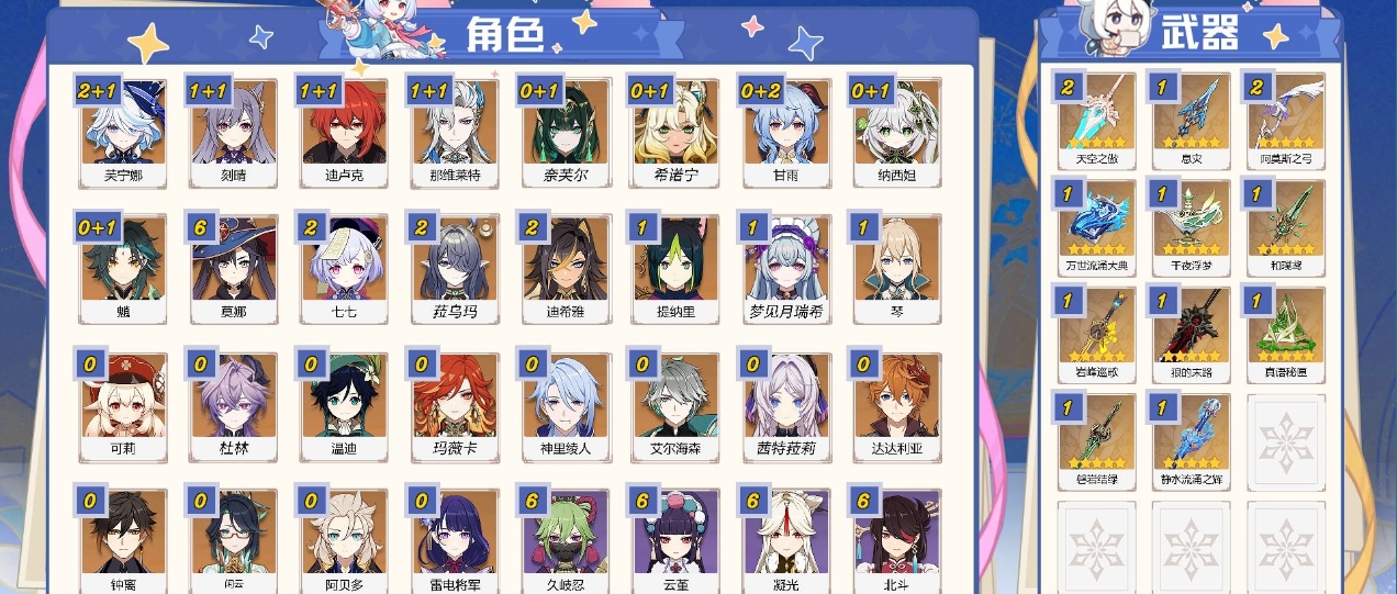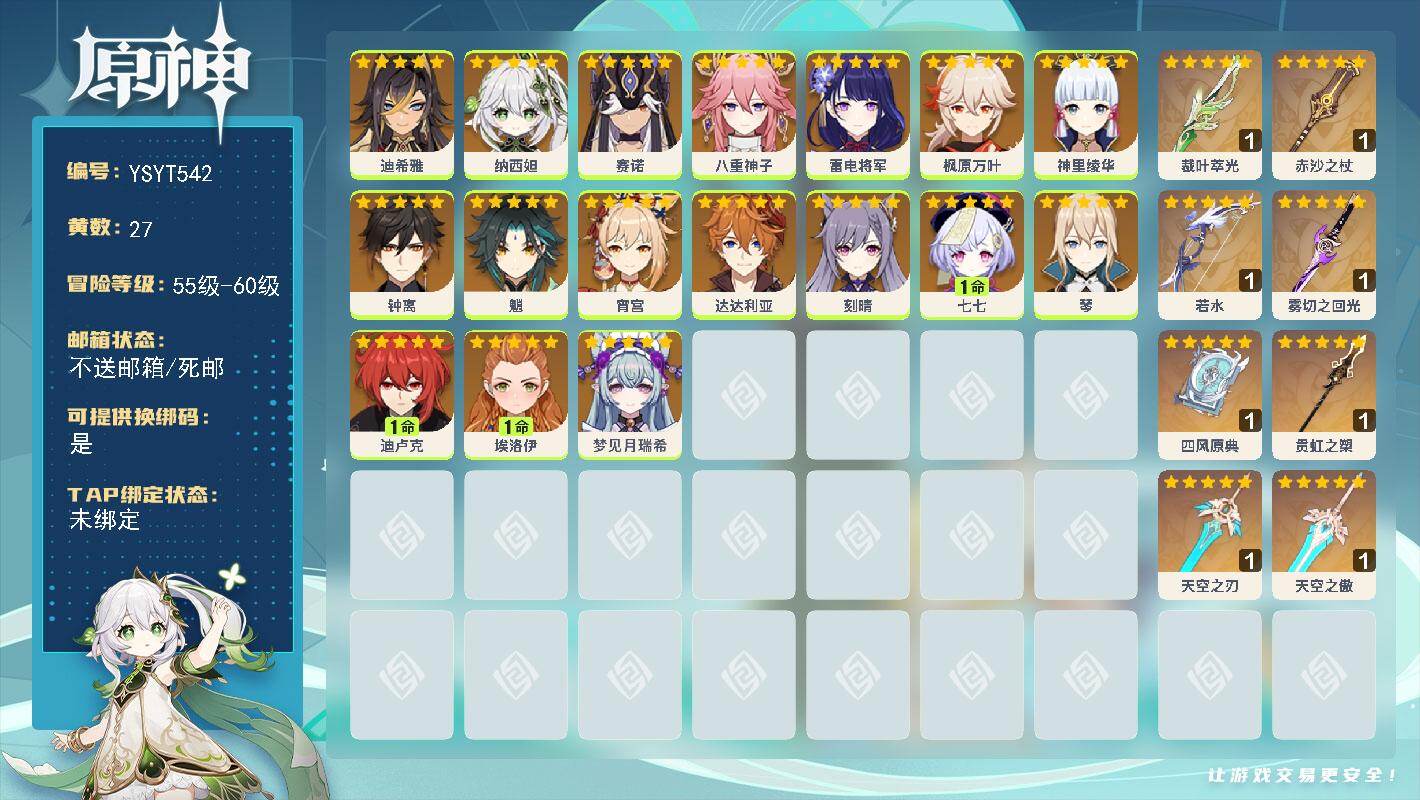 57级/27黄/女主/17个五星角色/8个五星武器/宵宫/钟离