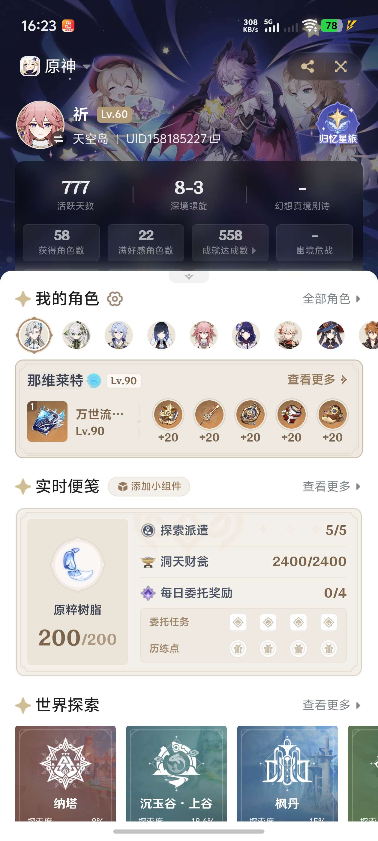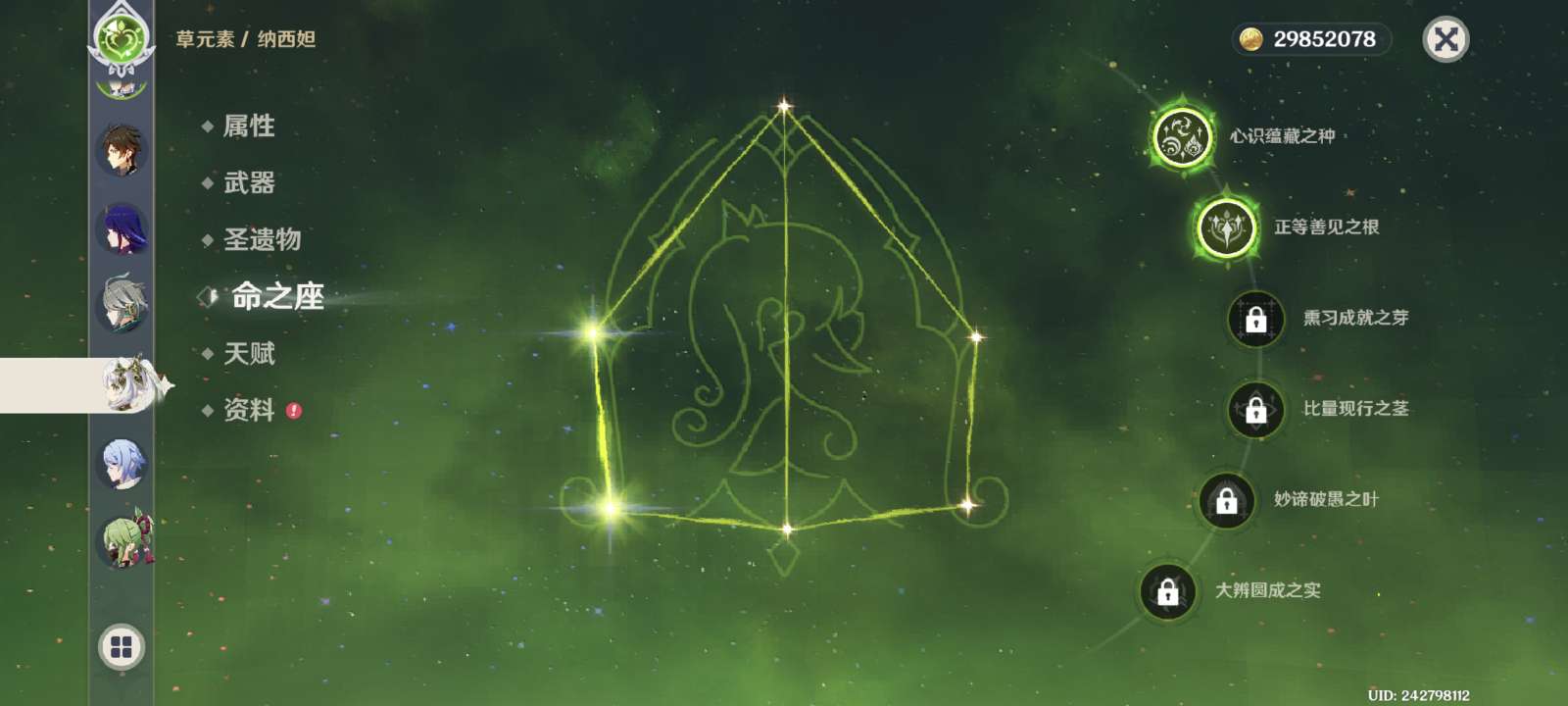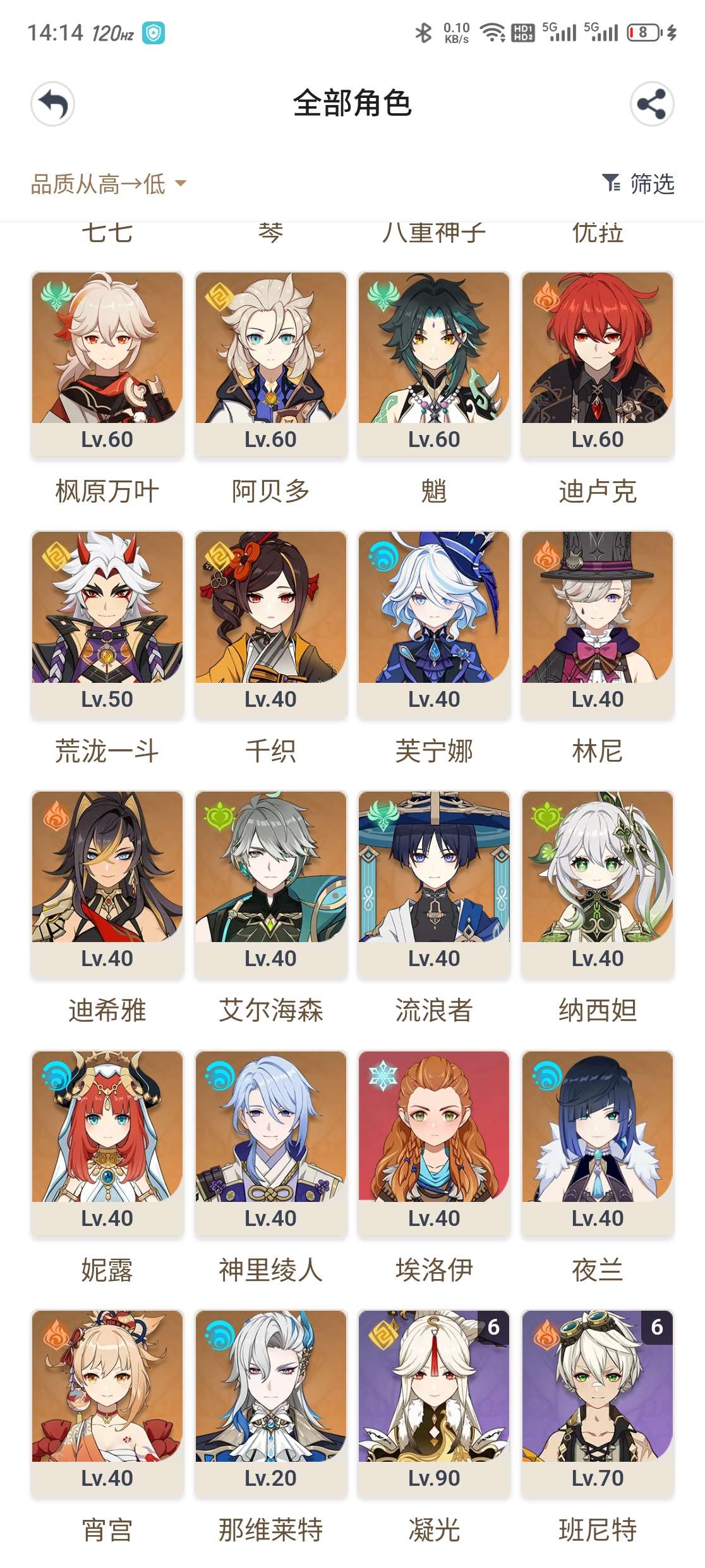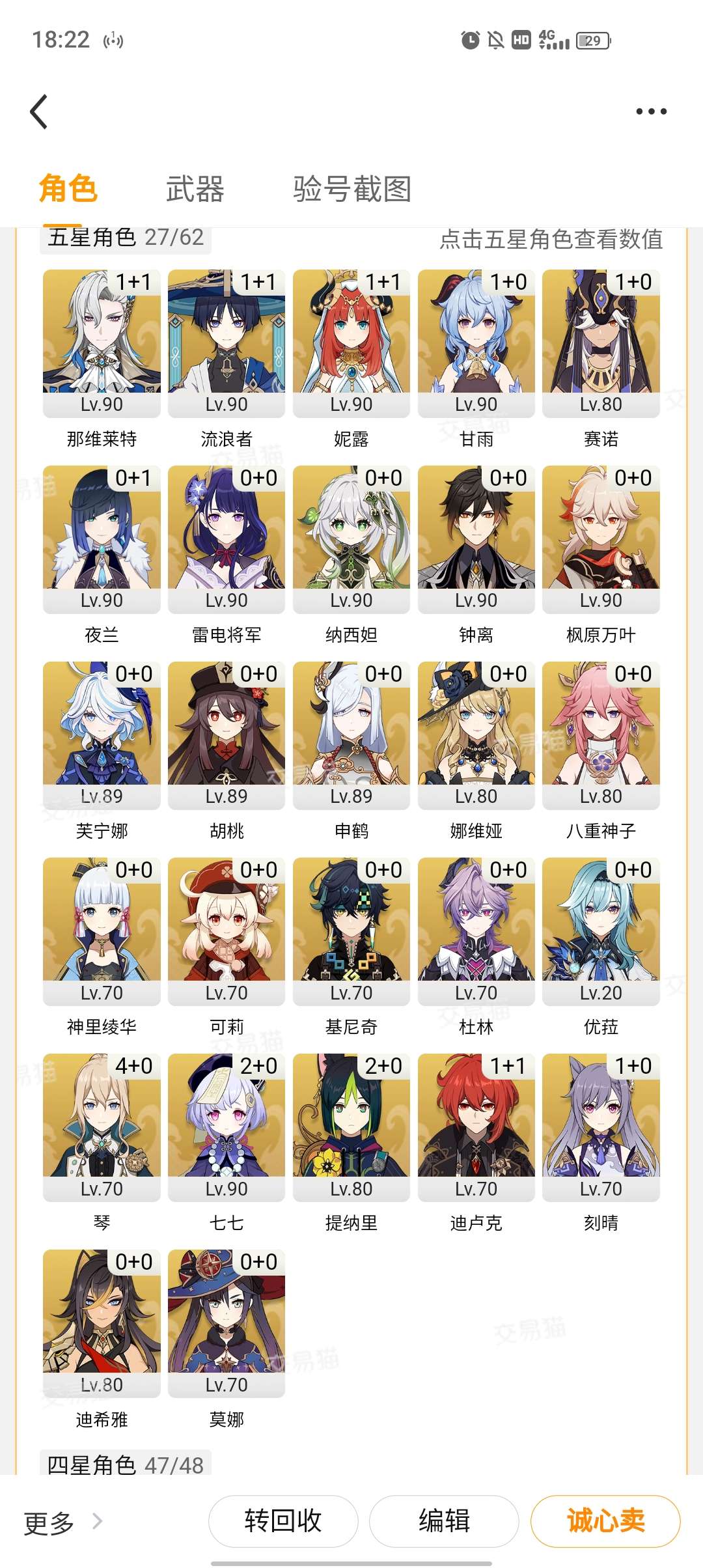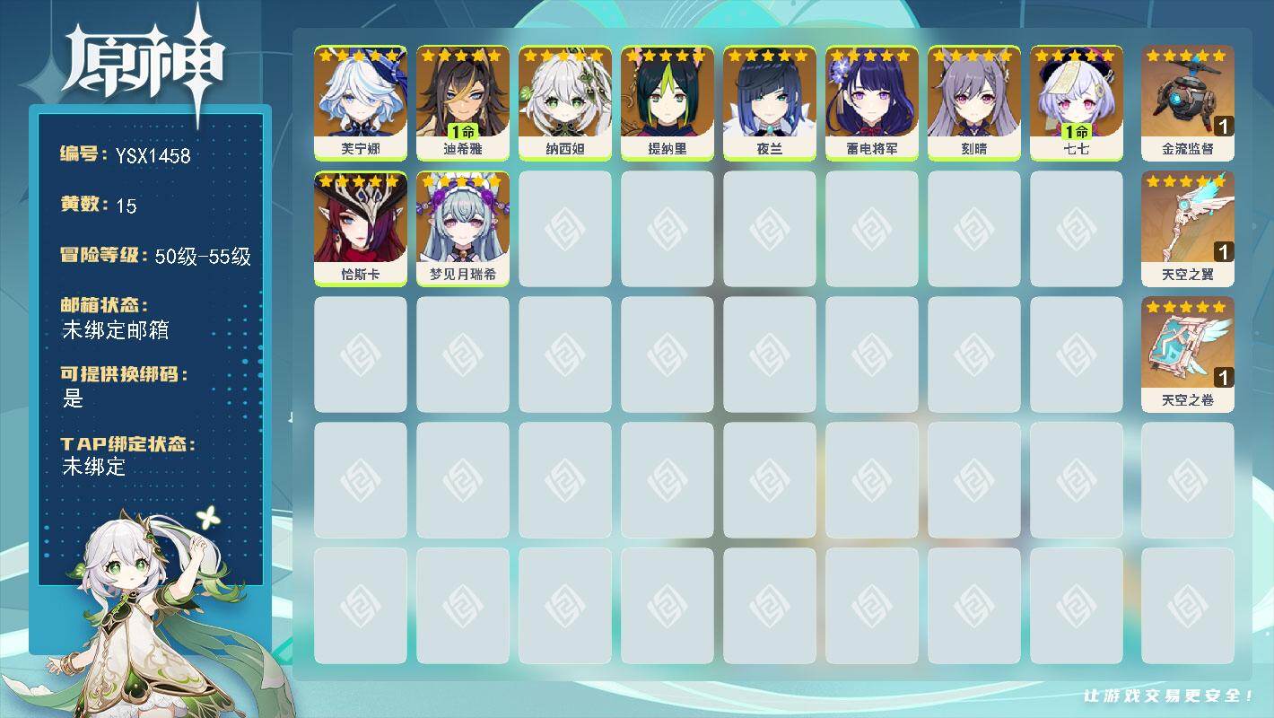58级/36黄/女主/17个五星角色/7个五星武器/满命纳西妲/夜兰