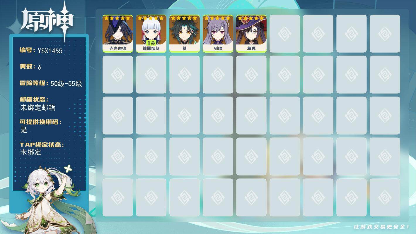 55级/6黄/女主/5个五星角色/莫娜/1命神里绫华/克洛琳德/魈/刻晴