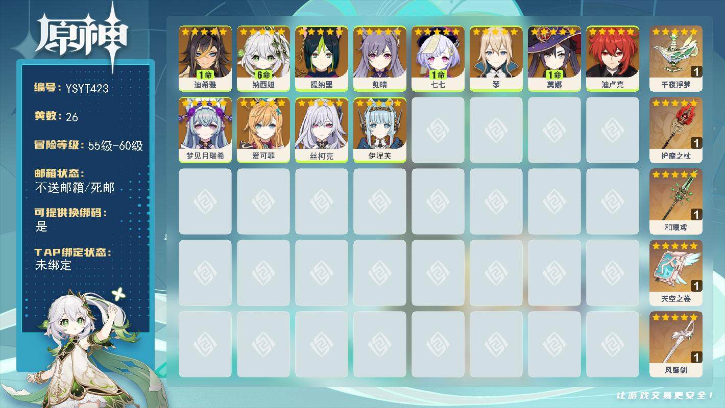 56级/26黄/女主/12个五星角色/5个五星武器/0命丝柯克