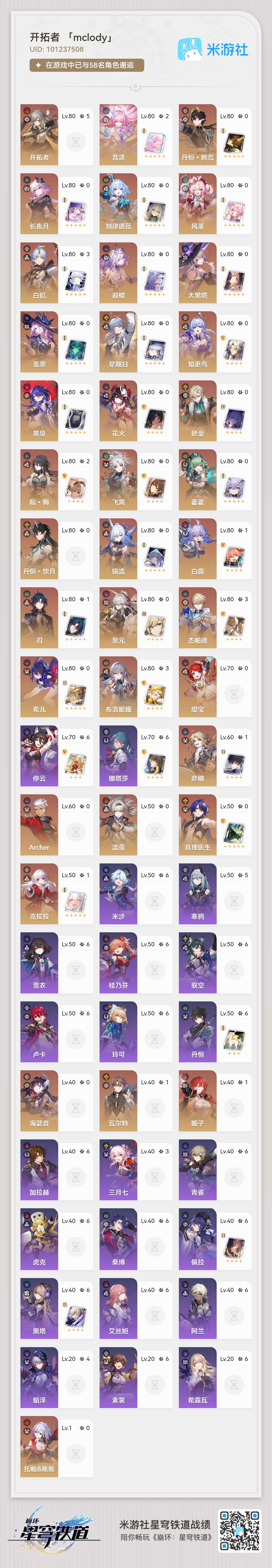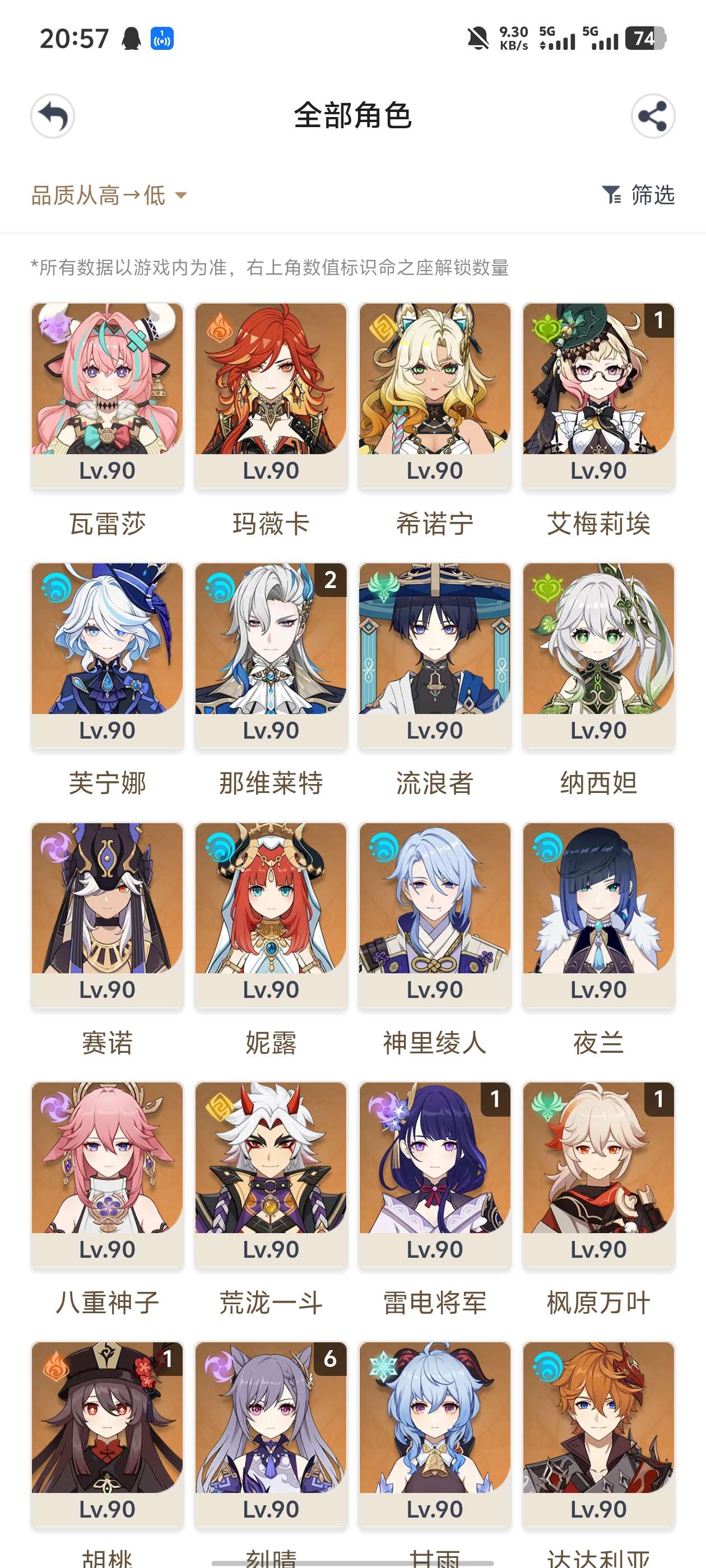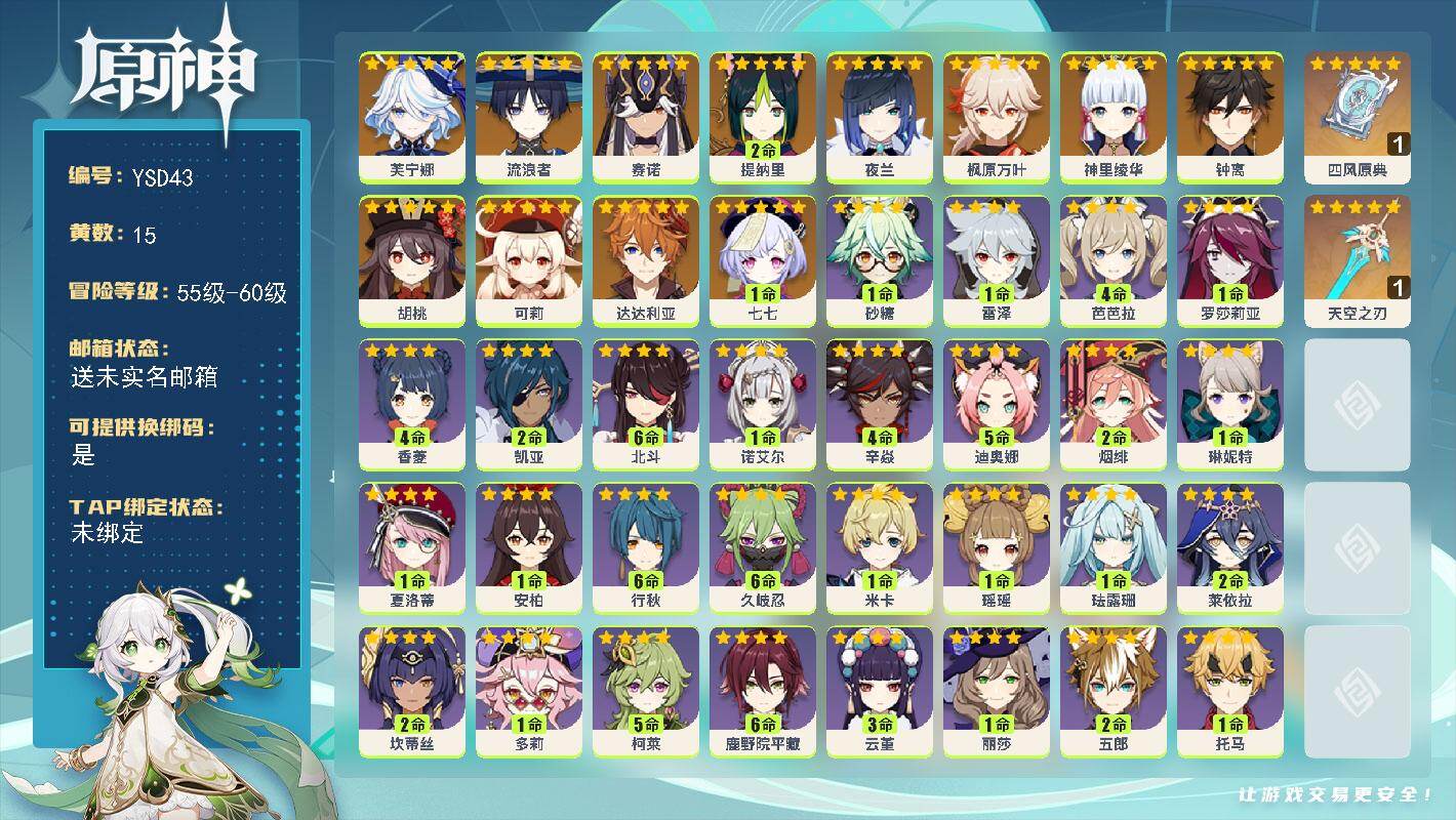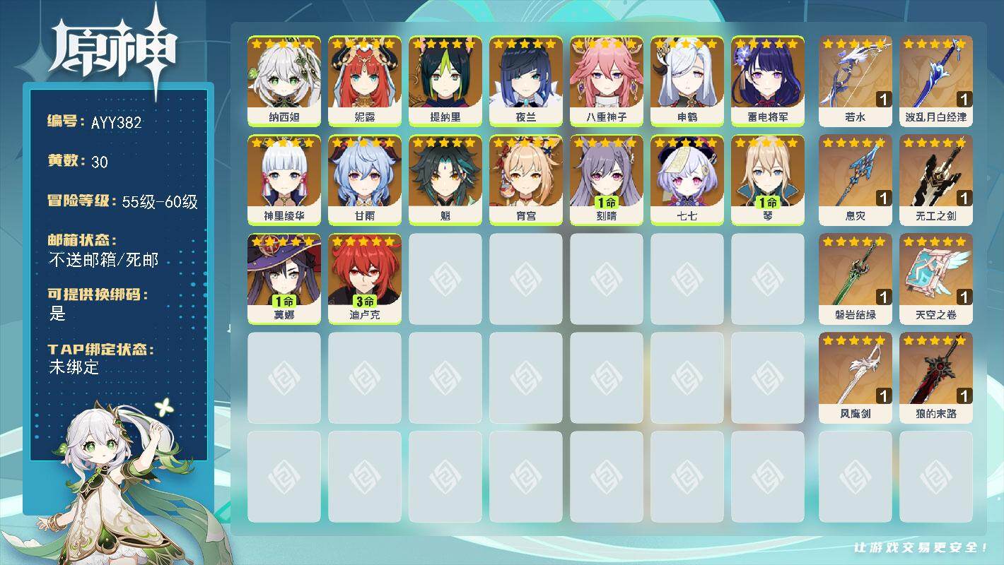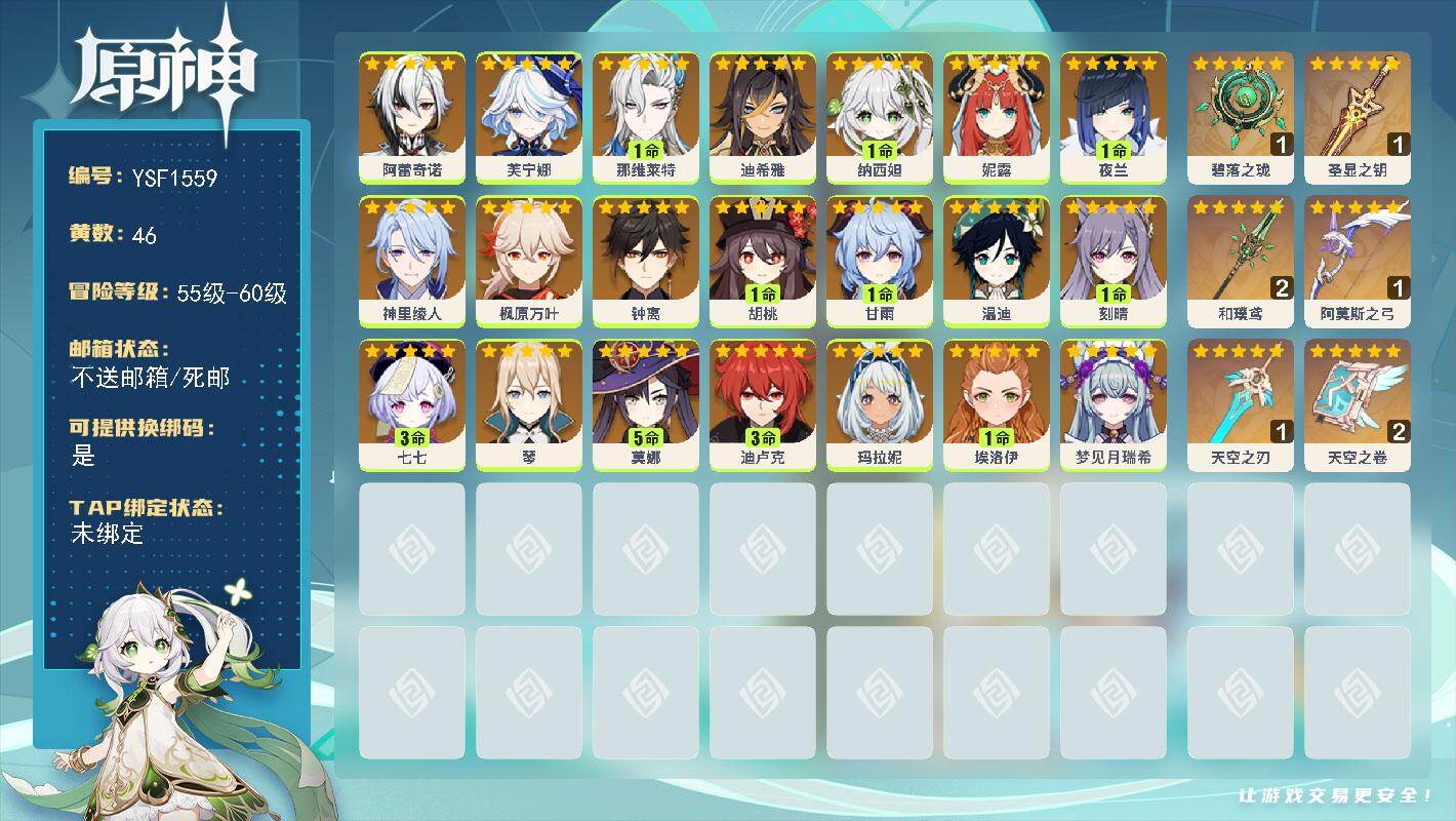 58级/30黄/女主/16个五星角色/8个五星武器0命纳西妲,0命妮露,0命