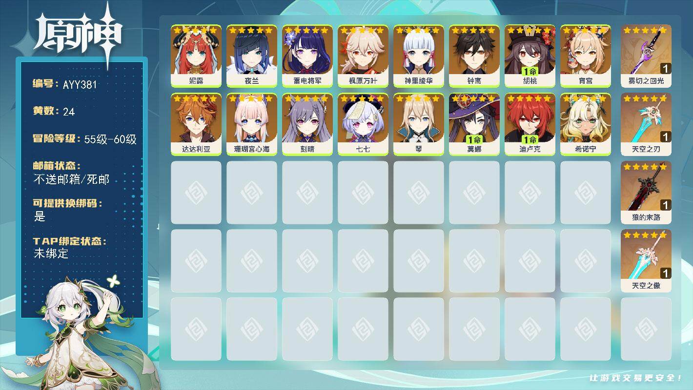 56级/24黄/男主/16个五星角色/5个五星武器0命妮露,0命夜兰,0命雷