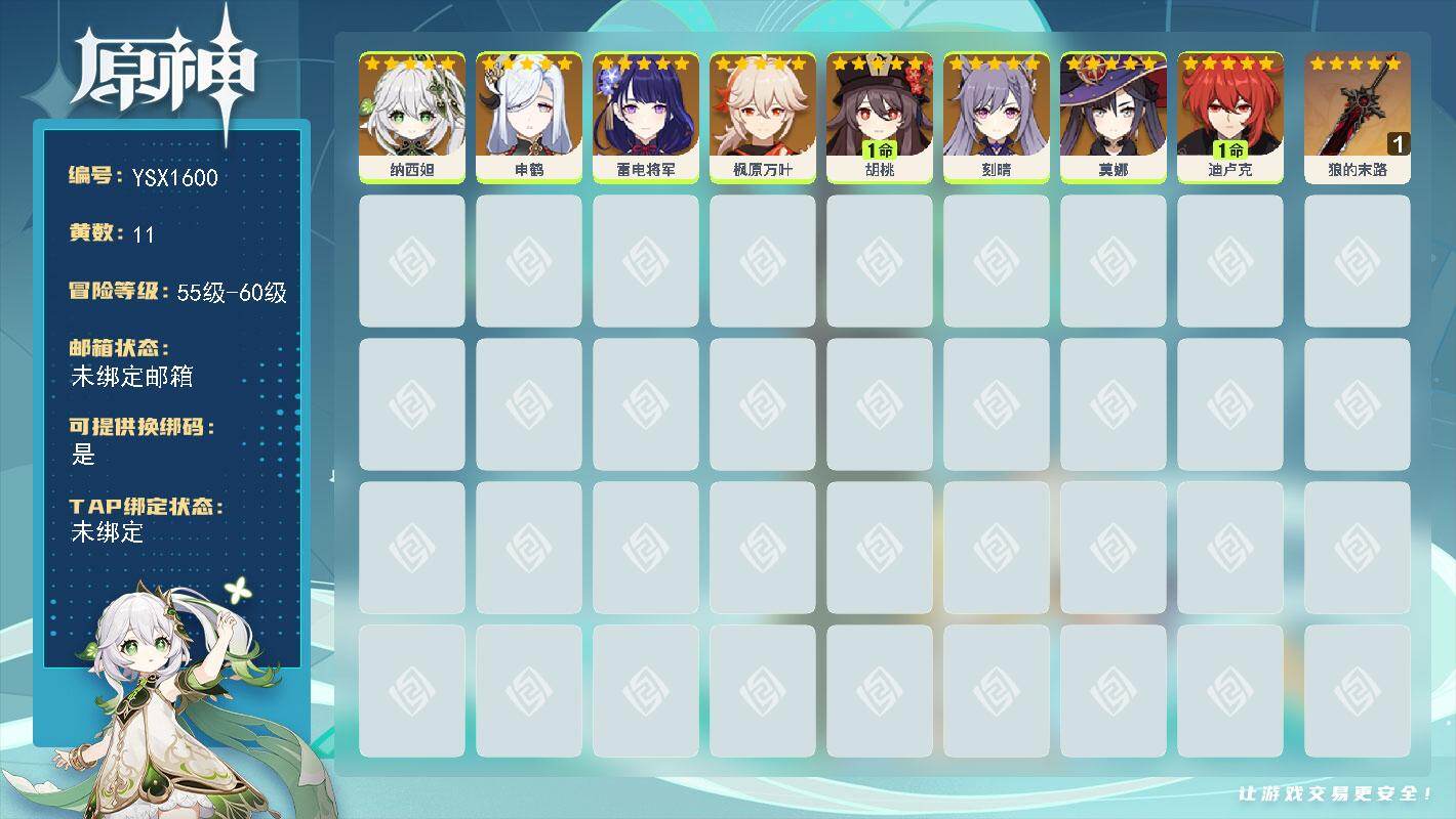 56级/11黄/女主/8个五星角色/1个五星武器/1命胡桃/雷电将军/纳西妲/1命迪卢克/申鹤/刻晴/枫原万叶/莫娜/狼的末路