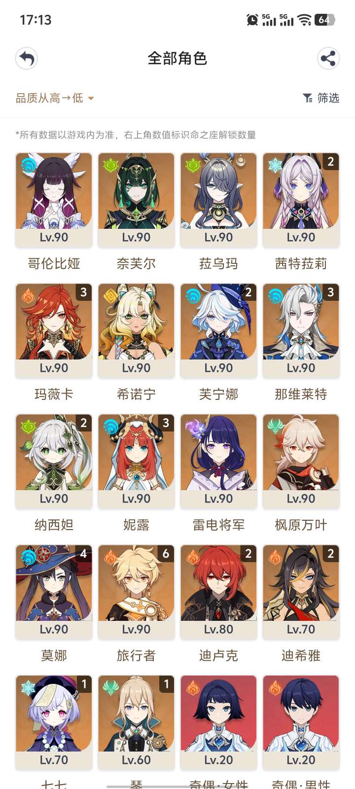 56级/15黄/女主/13个五星角色/2个五星武器/芙宁娜/流浪者/赛诺/2命提纳里