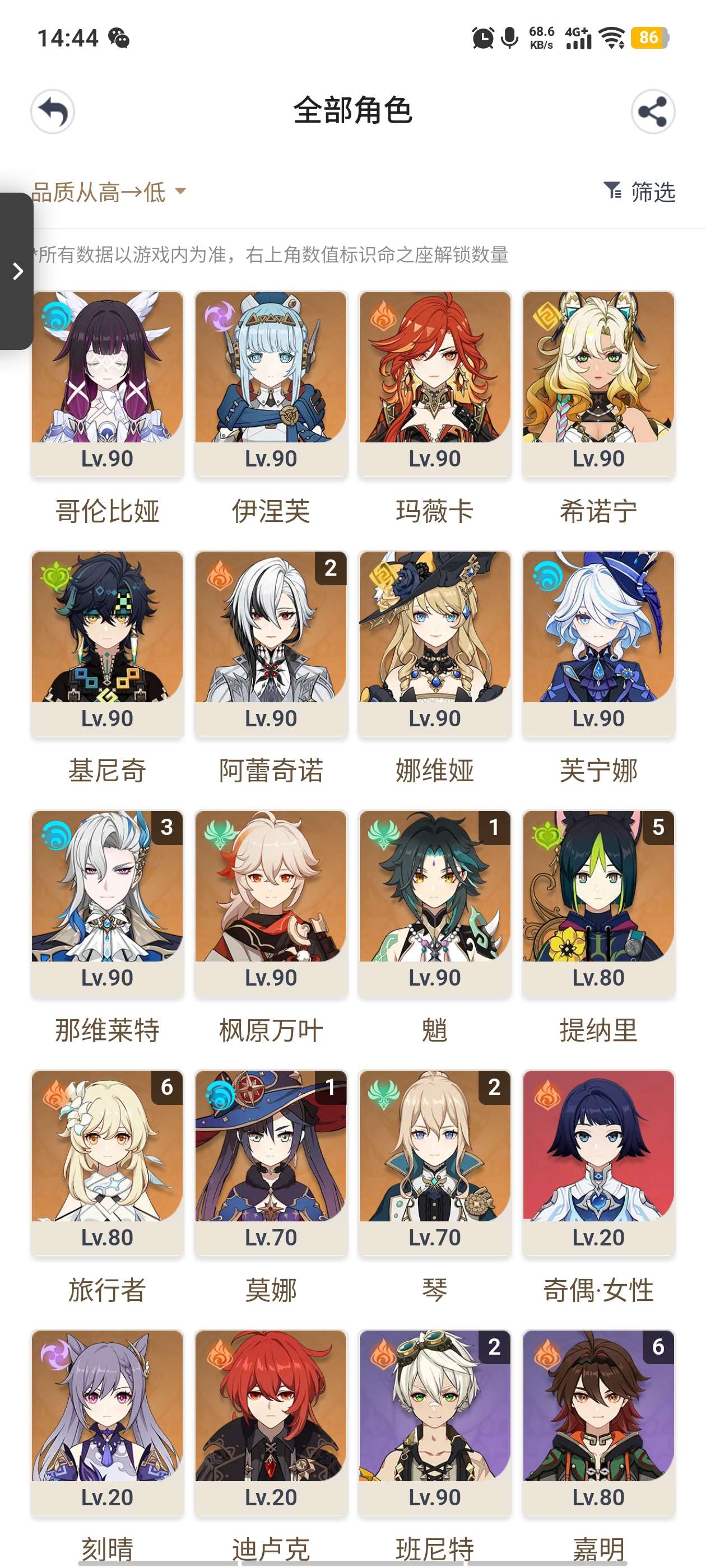 60级/57黄/女主/26个五星角色/14个五星武器/那维莱特/阿
