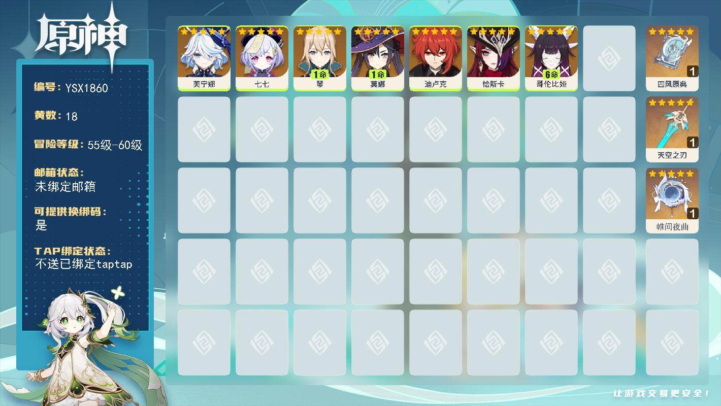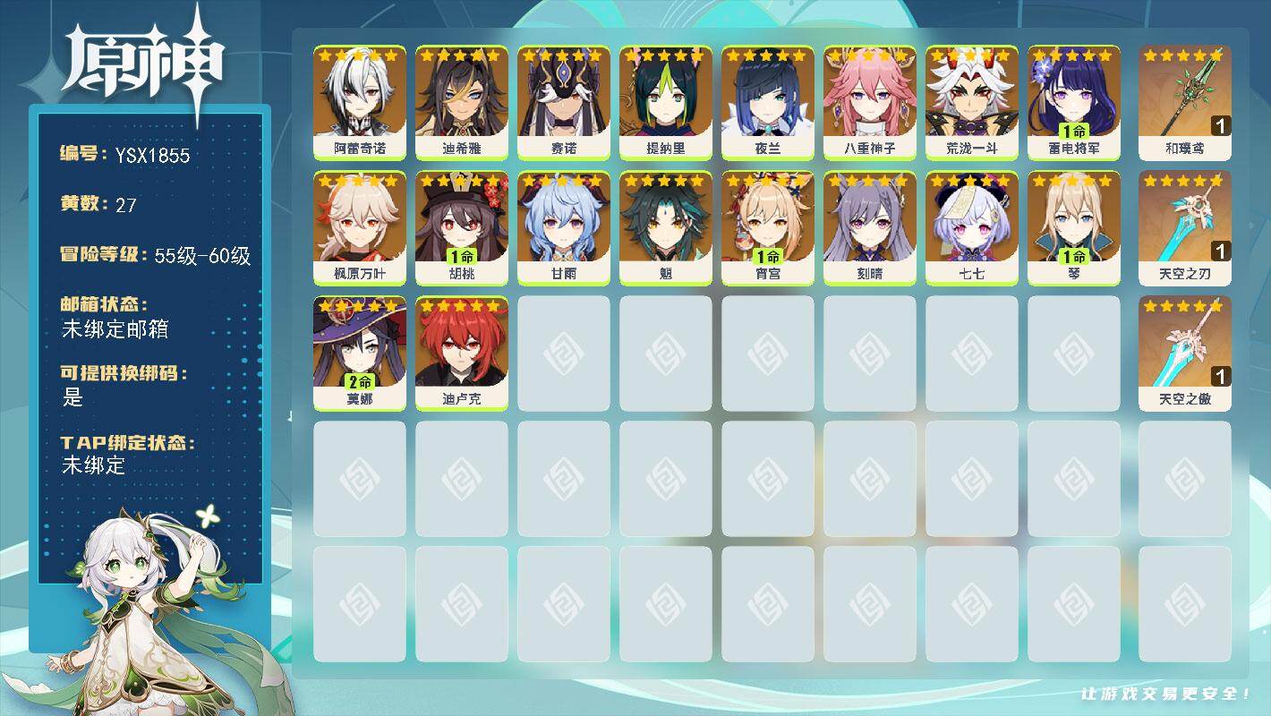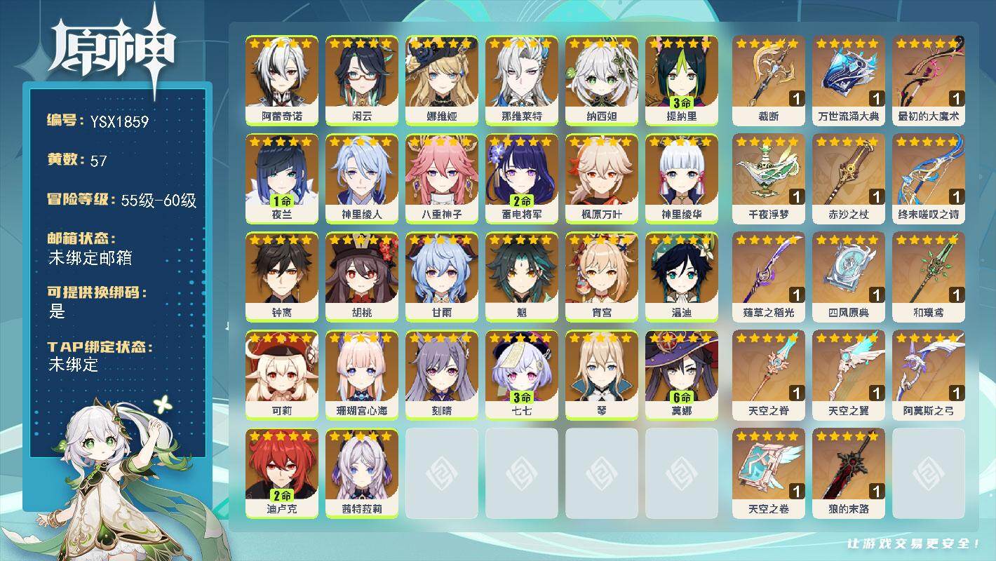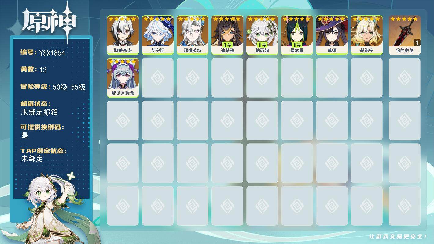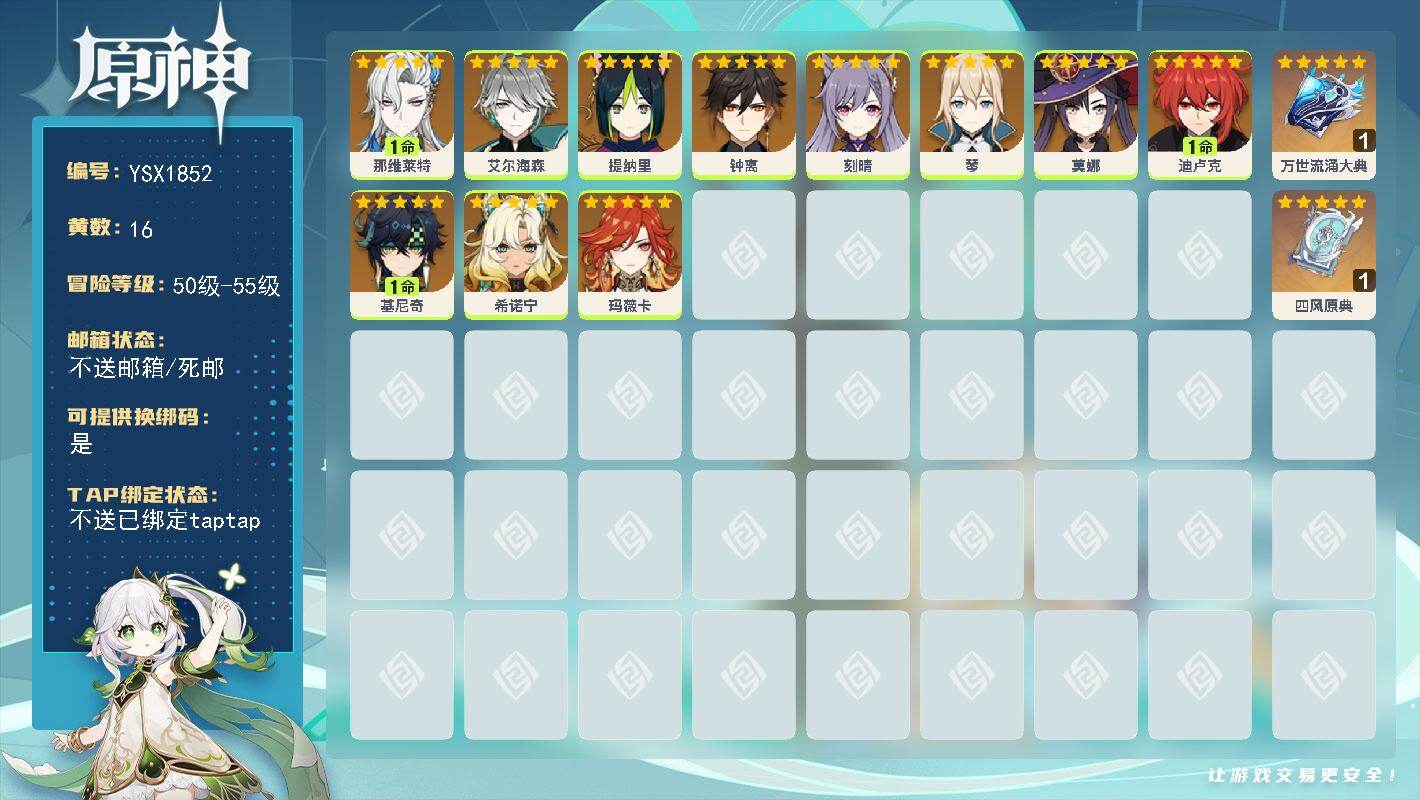 55级/16黄/女主/11个五星角色/2个五星武器/希诺宁/1命那