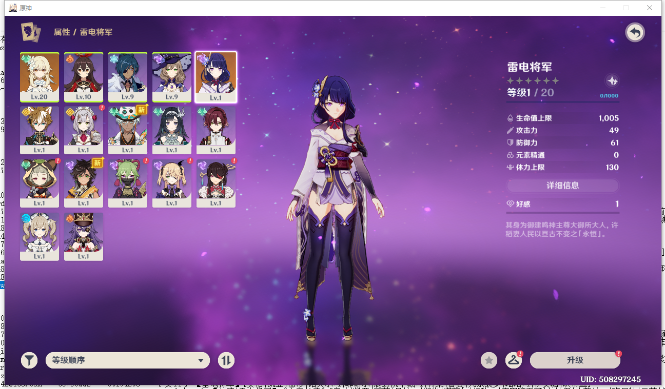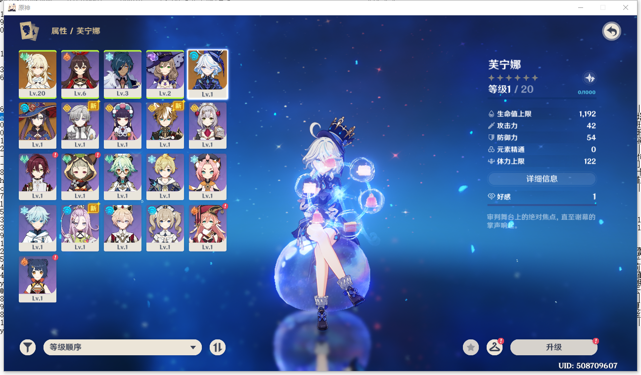 7级/女主/3个五星角色/优菈/莫娜/0命爱诺/久岐忍/罗莎莉亚/0命菲谢尔