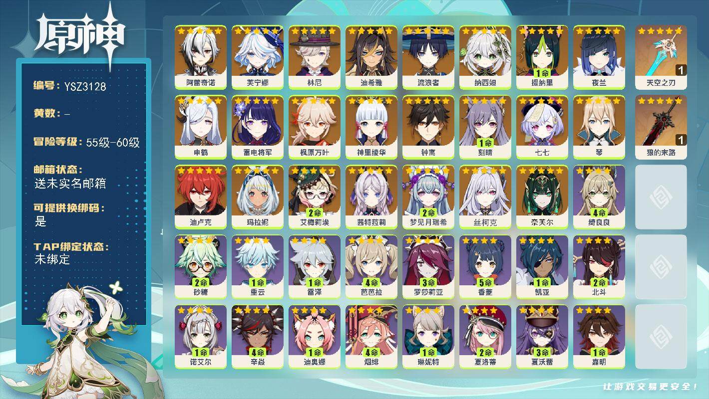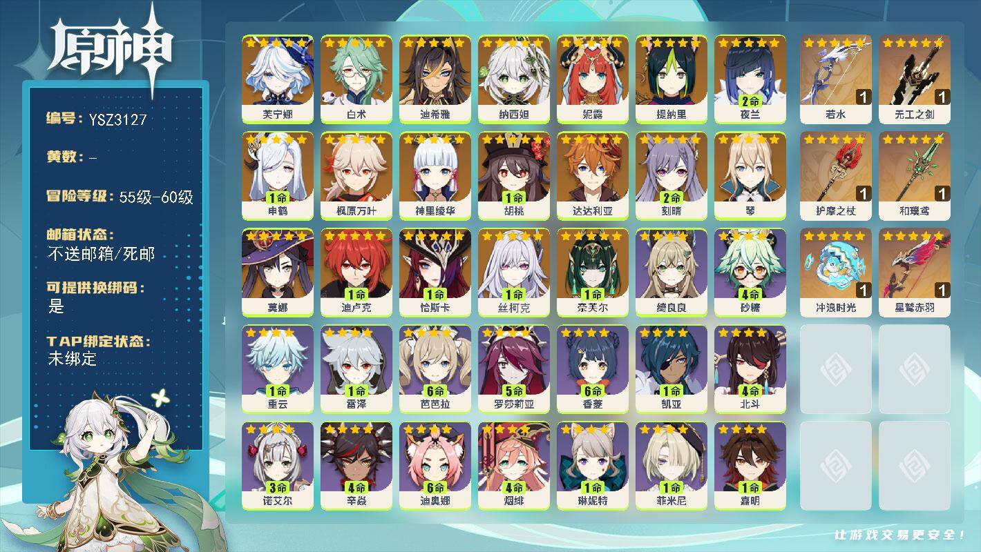 60级/55黄/男主/29个五星角色/7个五星武器0命闲云,0命芙宁娜,0命