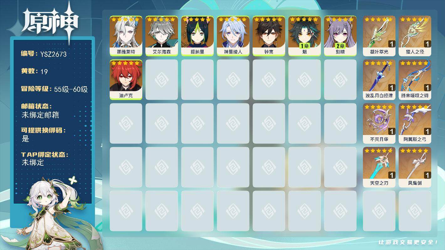 55级/10黄/女主/6个五星角色/1个五星武器/八重神子/钟离/2命刻晴/1命莫娜/提纳里/梦见月瑞希/狼的末路