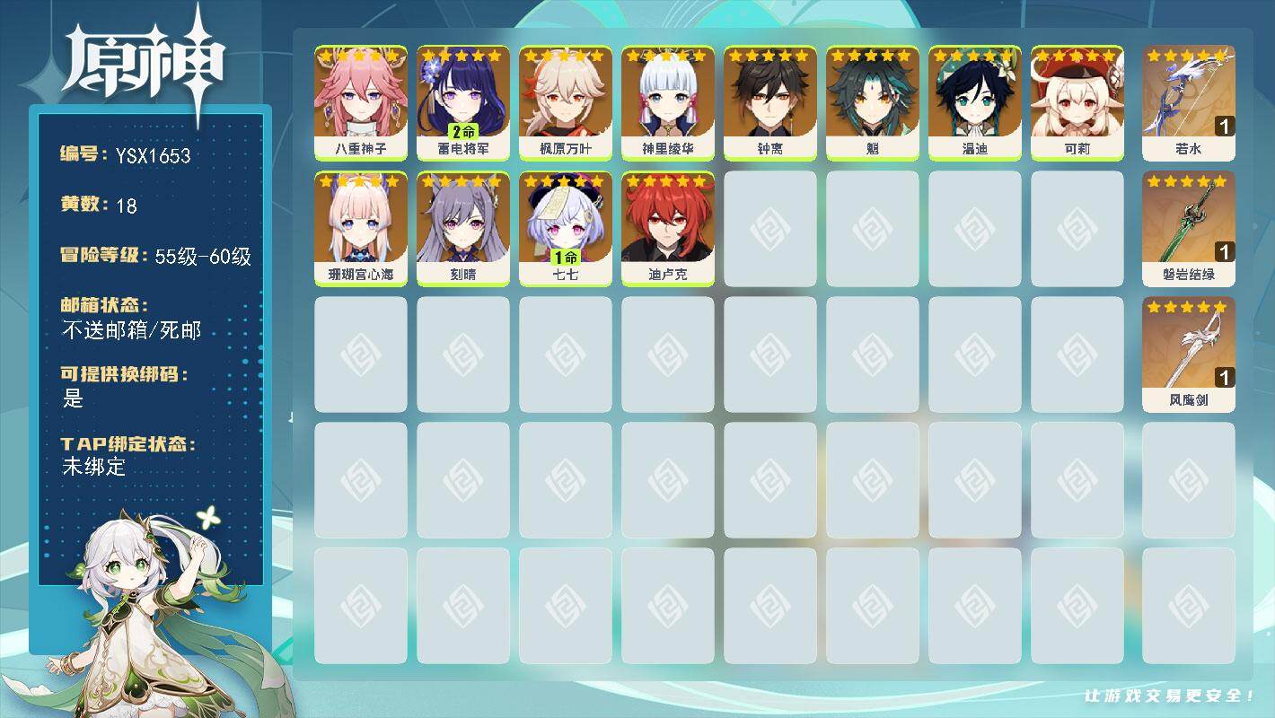 60级/50黄/女主/26个五星角色/11个五星武器/神里绫华/1命八重神子