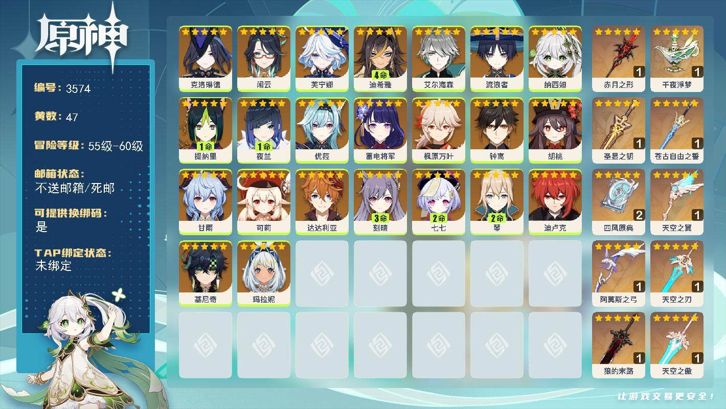60级/47黄/男主/23个五星角色/10个五星武器0命克洛琳德,0命闲云,