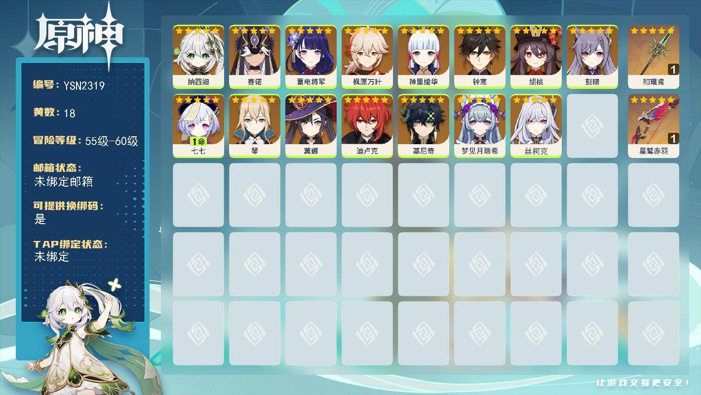 55级/14黄/女主/8个五星角色/2个五星武器/钟离/胡桃/枫原万叶/纳西妲/千织/刻晴/3命莫娜/提纳里/精2阿莫斯之弓/薙草之稻光