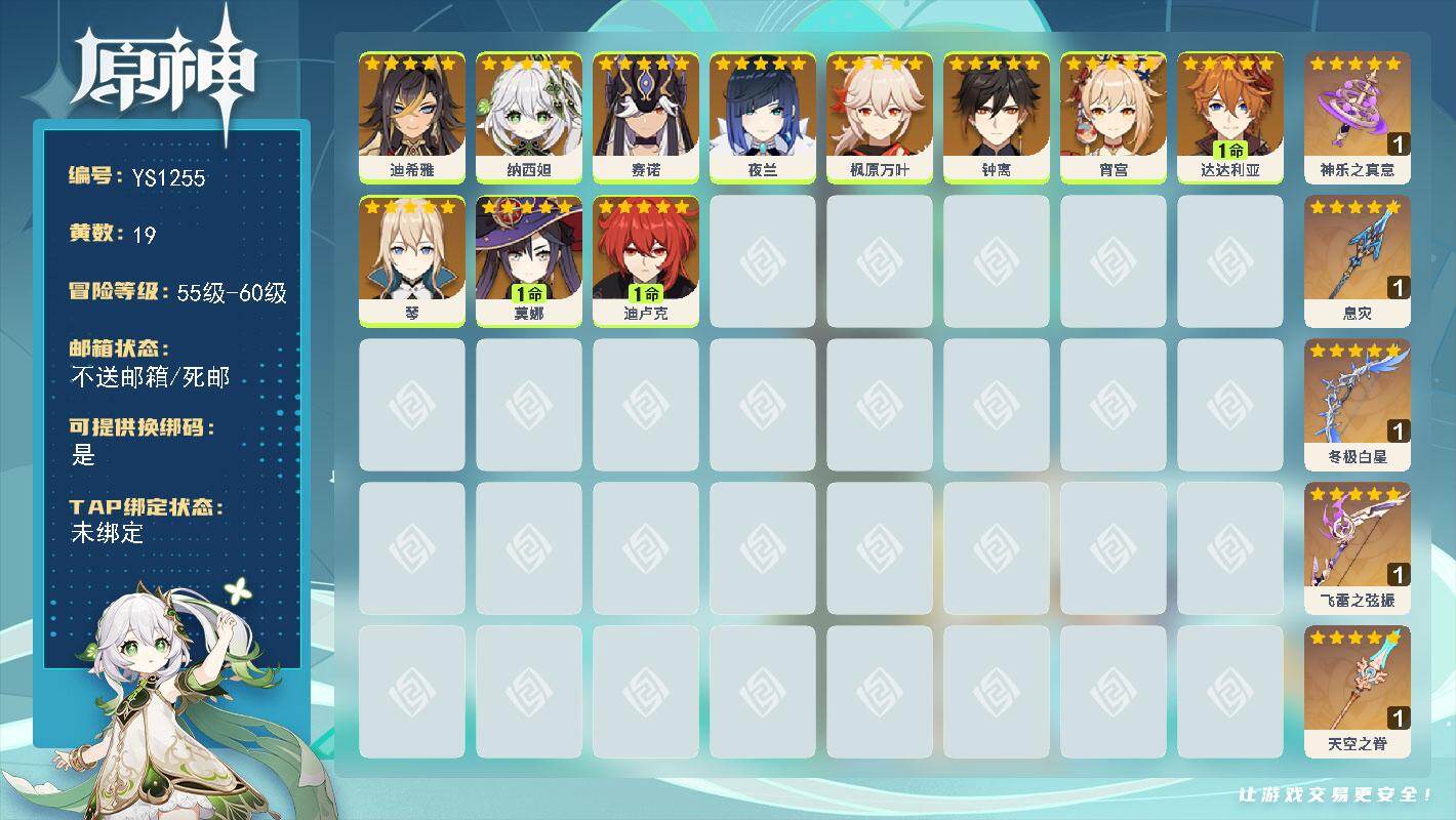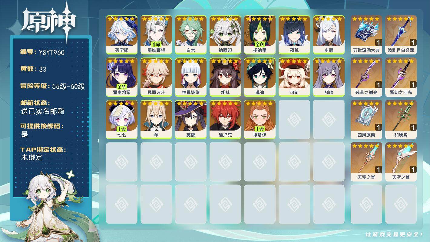 56级/19黄/女主/11个五星角色/5个五星武器/纳西妲/夜兰/