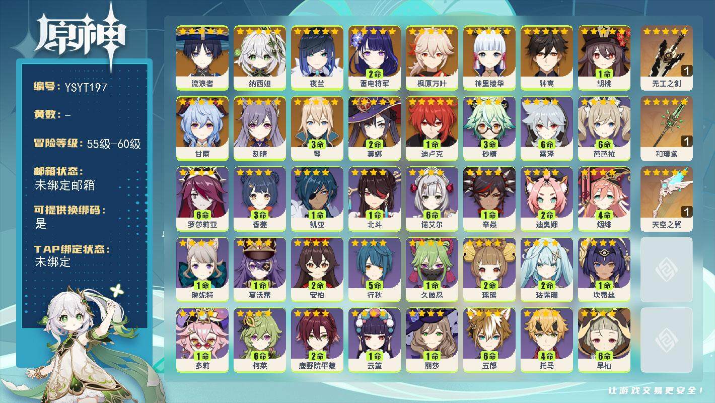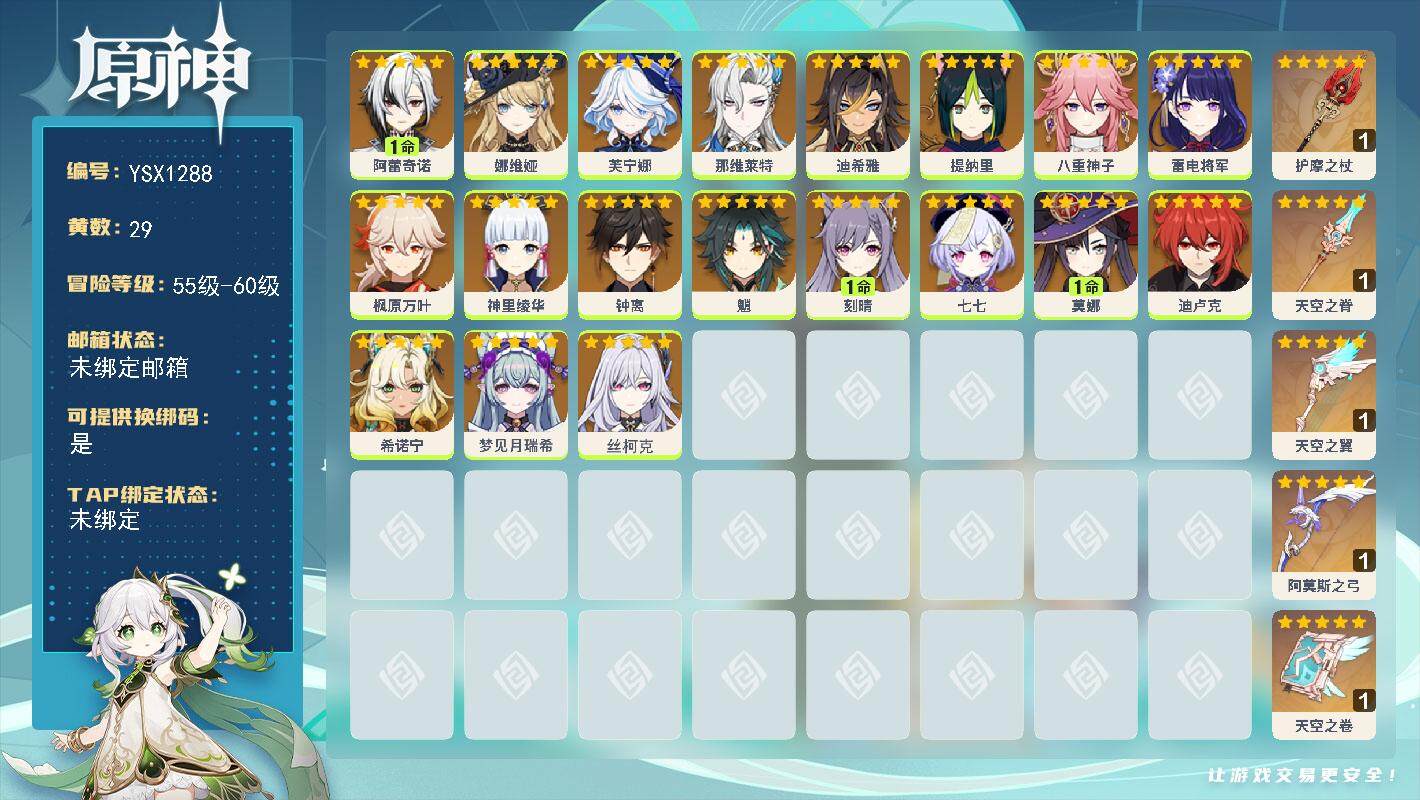59级/29黄/女主/19个五星角色/7个五星武器/