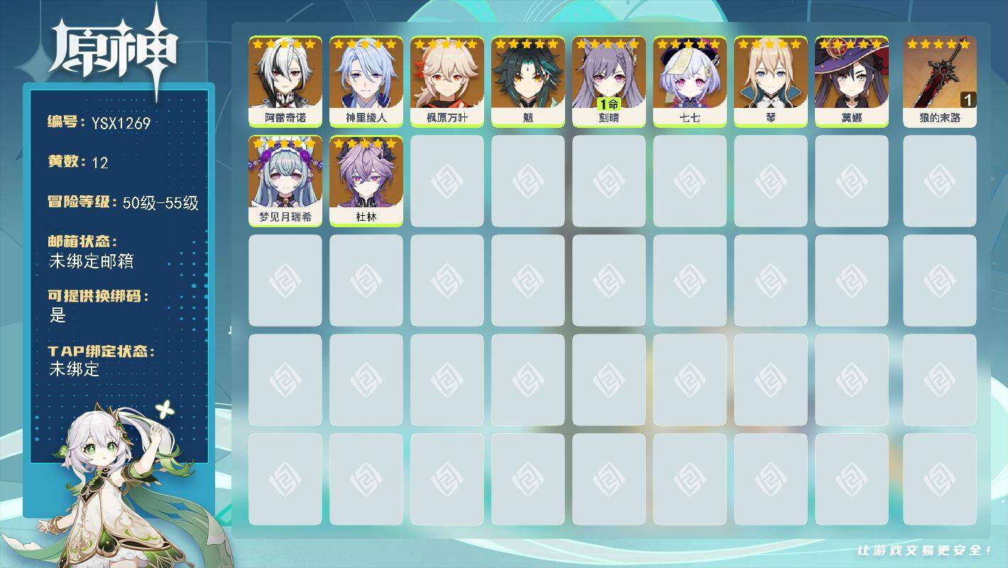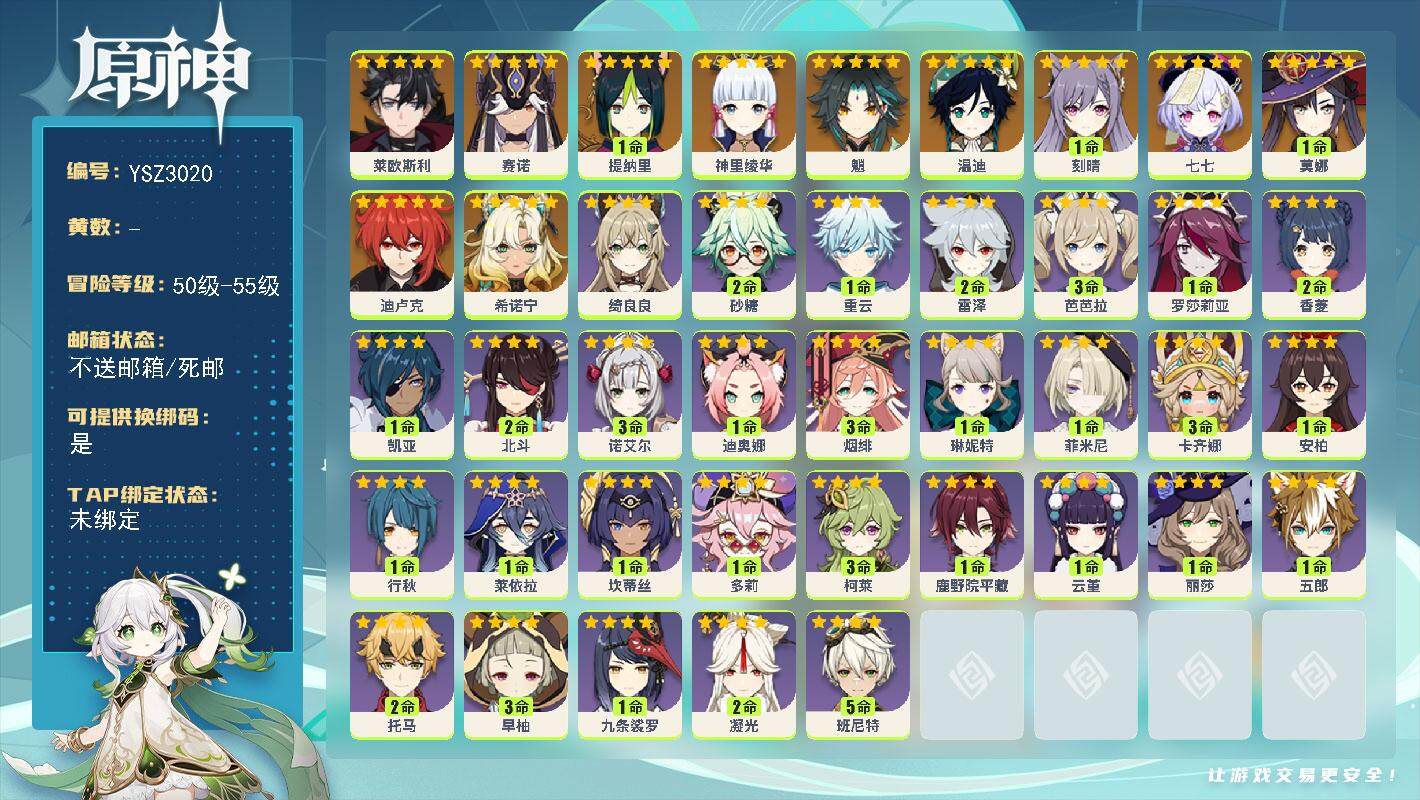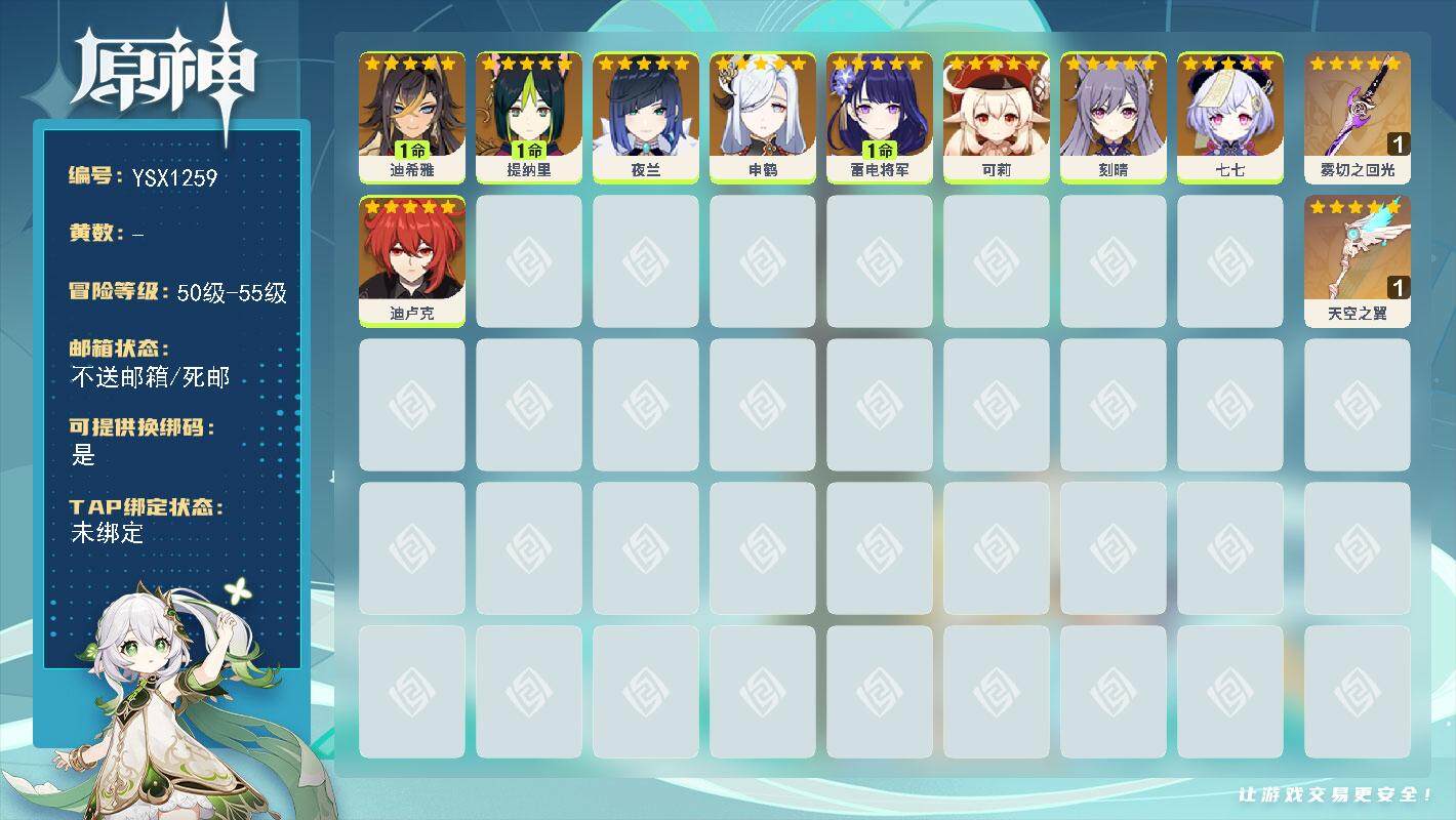 55级/女主/1命迪希雅/1命提纳里/夜兰/申鹤/1命雷电将军/可莉/刻晴/迪卢克/七七/雾切之回光/天空之翼