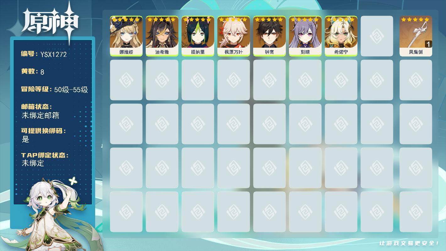 53级/8黄/女主/7个五星角色/1个五星武器/娜维娅/钟离/枫原万叶/希诺宁/提纳里/迪希雅/刻晴/风鹰剑