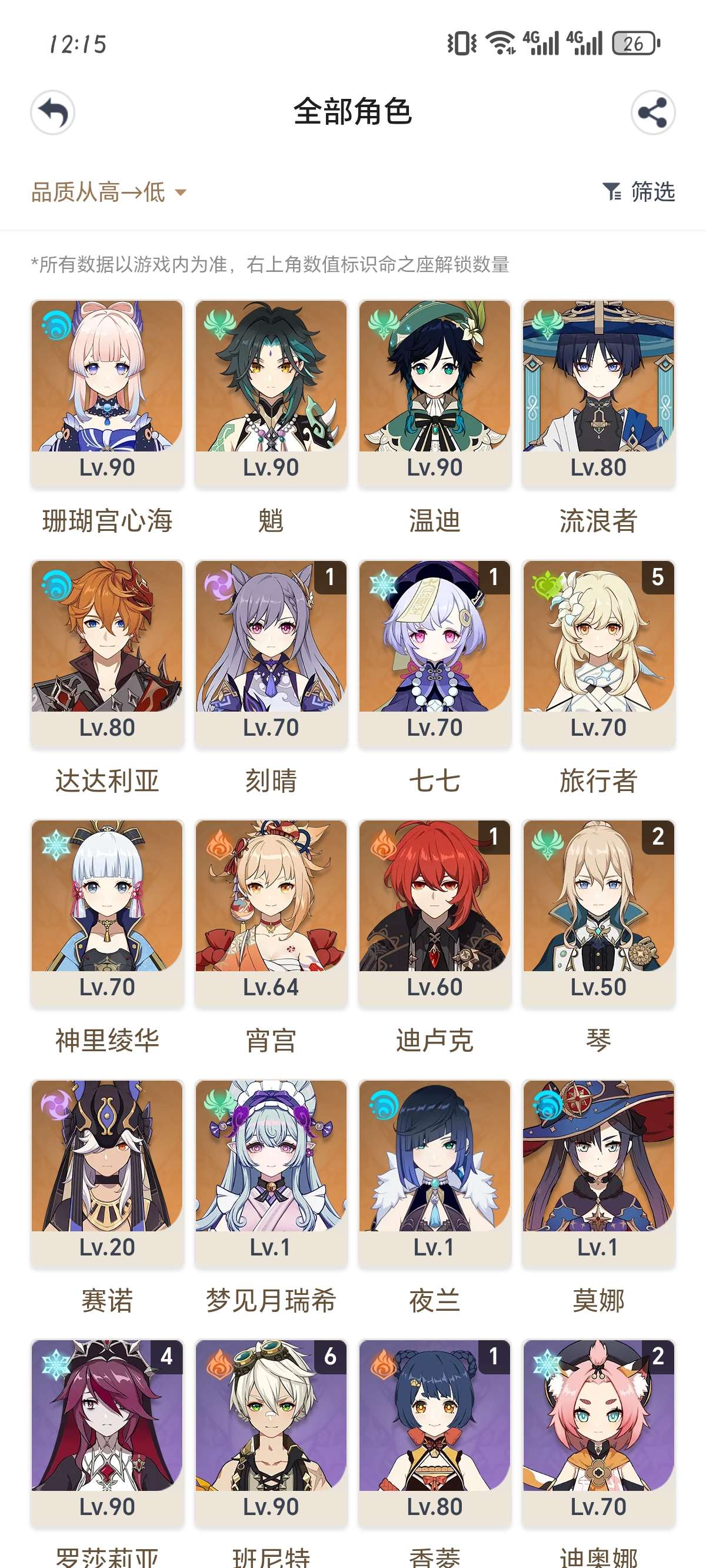 等级57女主角色五星角色17五星武器7