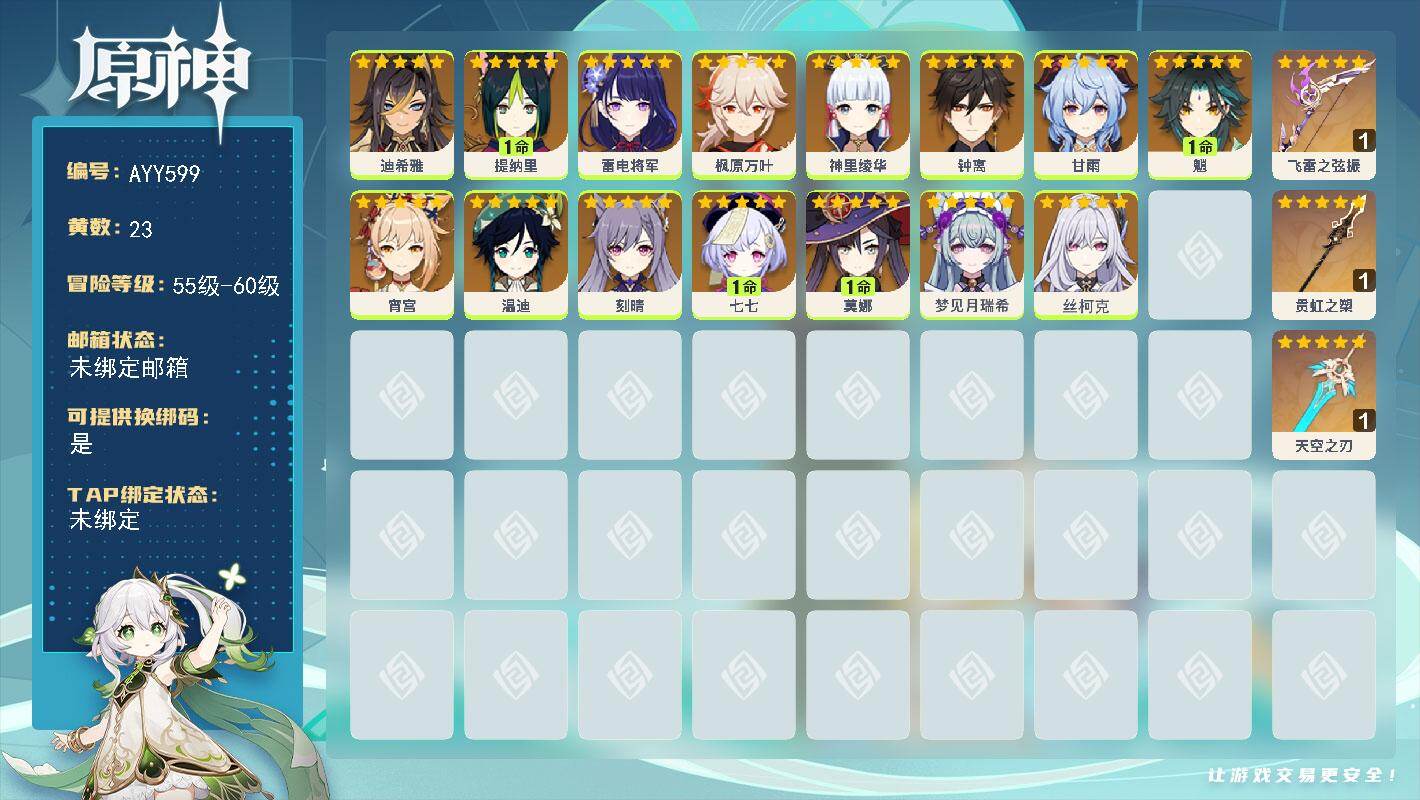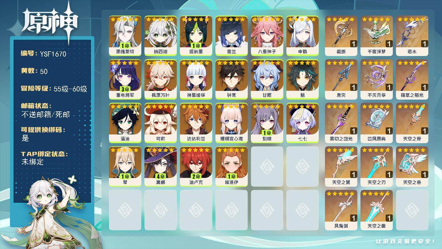 55级/16黄/女主/10个五星角色/2个五星武器/1命夜兰/枫原