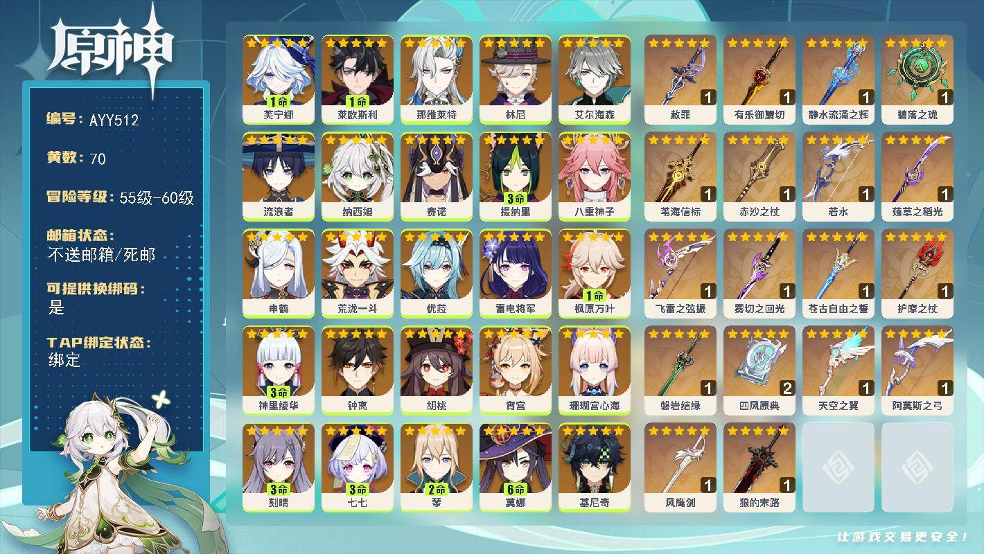 58级/男主/19个五星角色/纳西妲/珊瑚宫心海/雷电将军/宵宫/