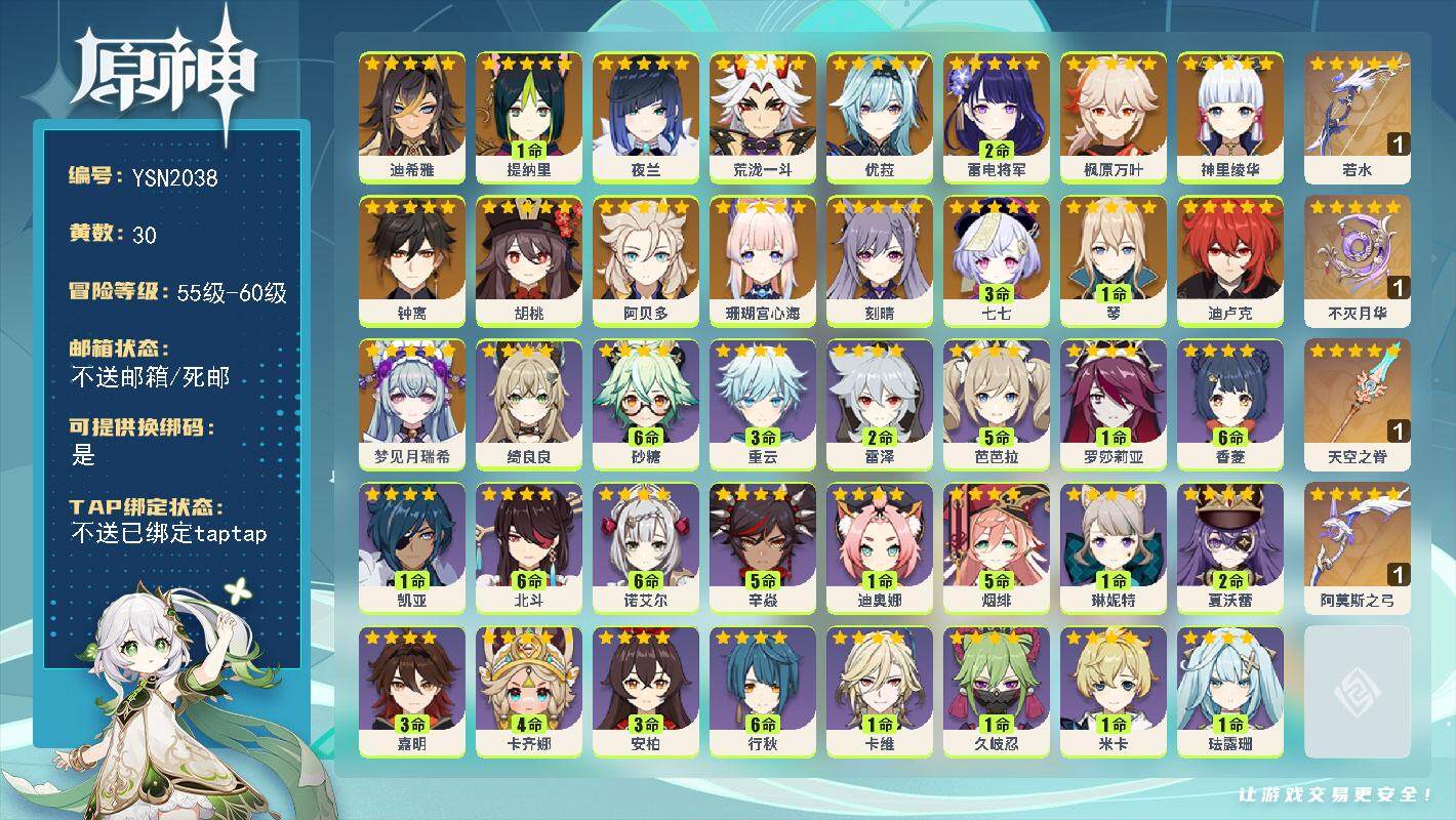 60级/36黄/女主/14个五星角色/5个五星武器/