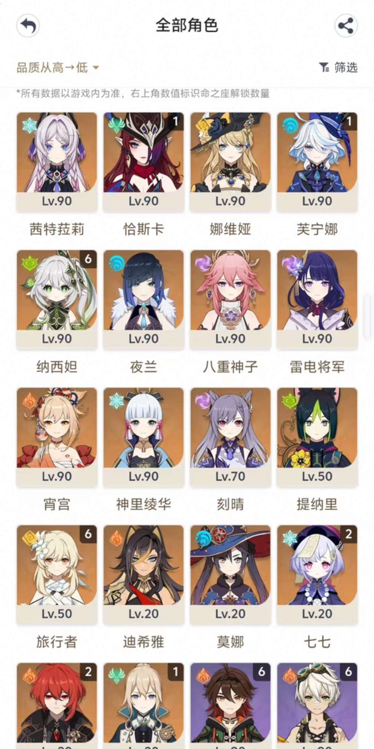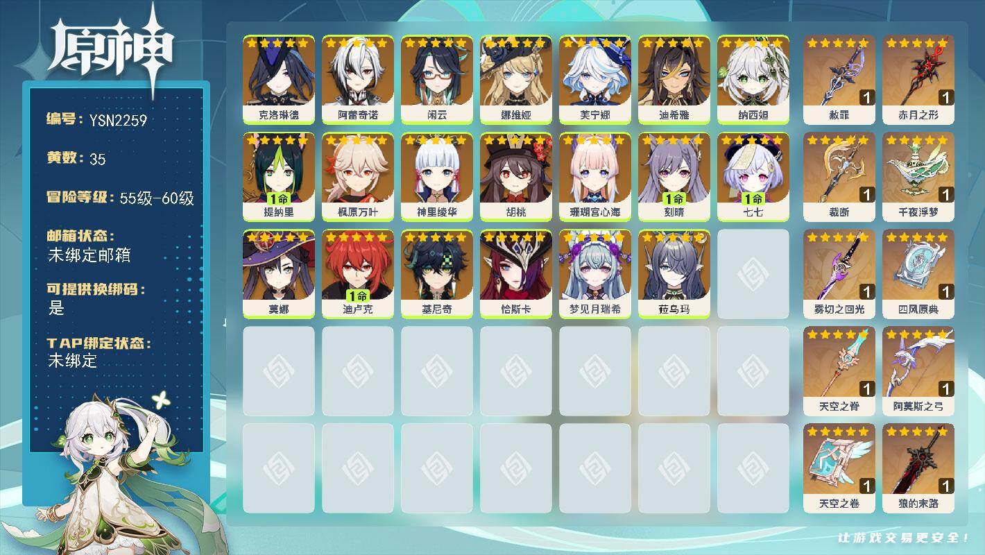 59级/35黄/女主/20个五星角色/11个五星武器/
