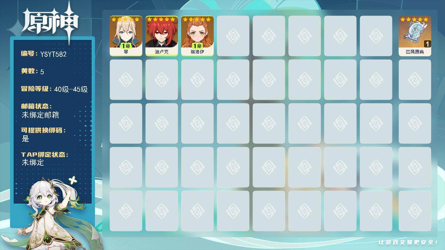 45级/5黄/女主/3个五星角色/1个五星武器/1命琴/迪卢克/0命埃洛伊/四风原典