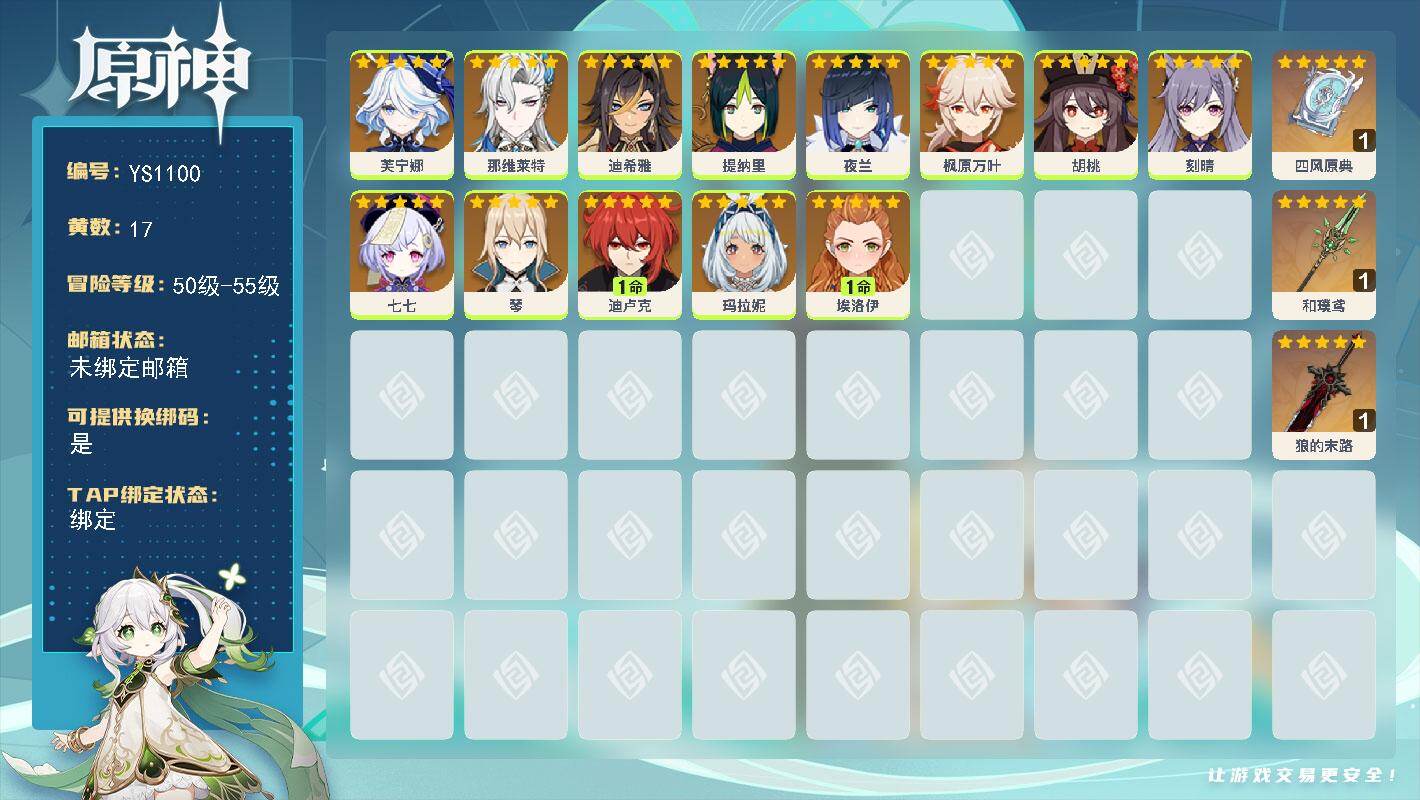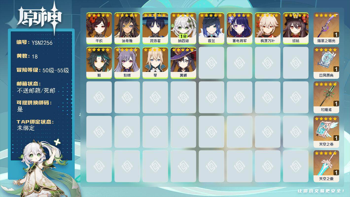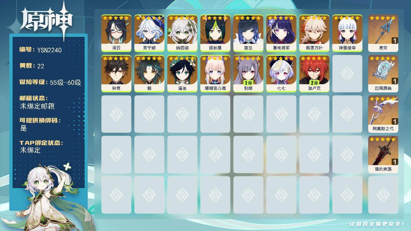 55级/18黄/女主/12个五星角色/5个五星武器/