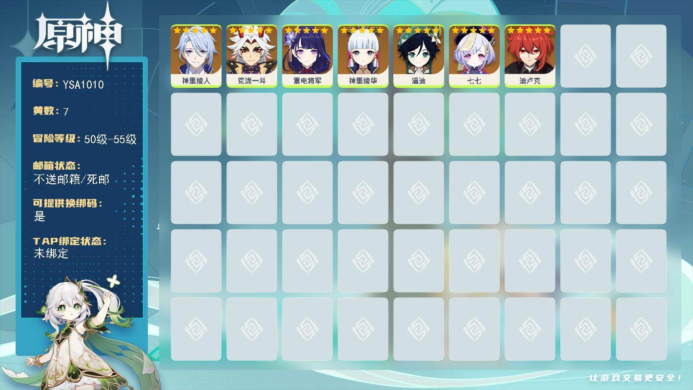 55级/7黄/女主/7个五星角色/雷电将军/神里绫华/荒泷一斗/温迪/七七/神里绫人/迪卢克