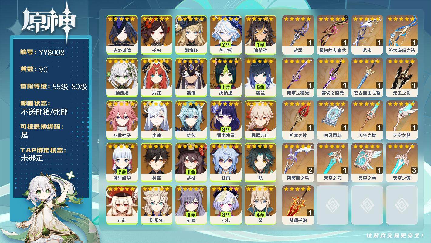 【YY8013】60级/79黄/女主/31个五星角色 0命娜维娅,2命芙宁娜,