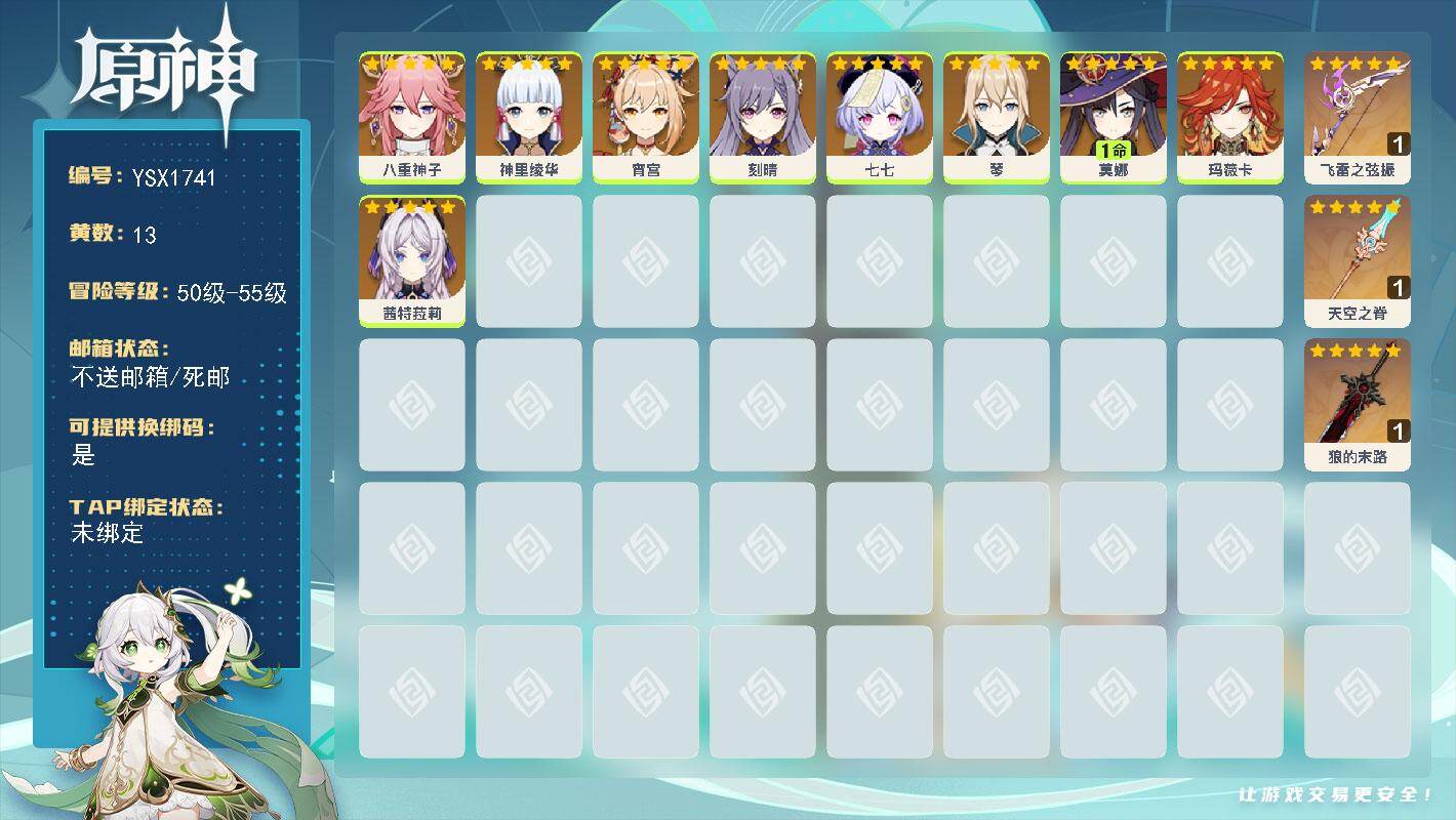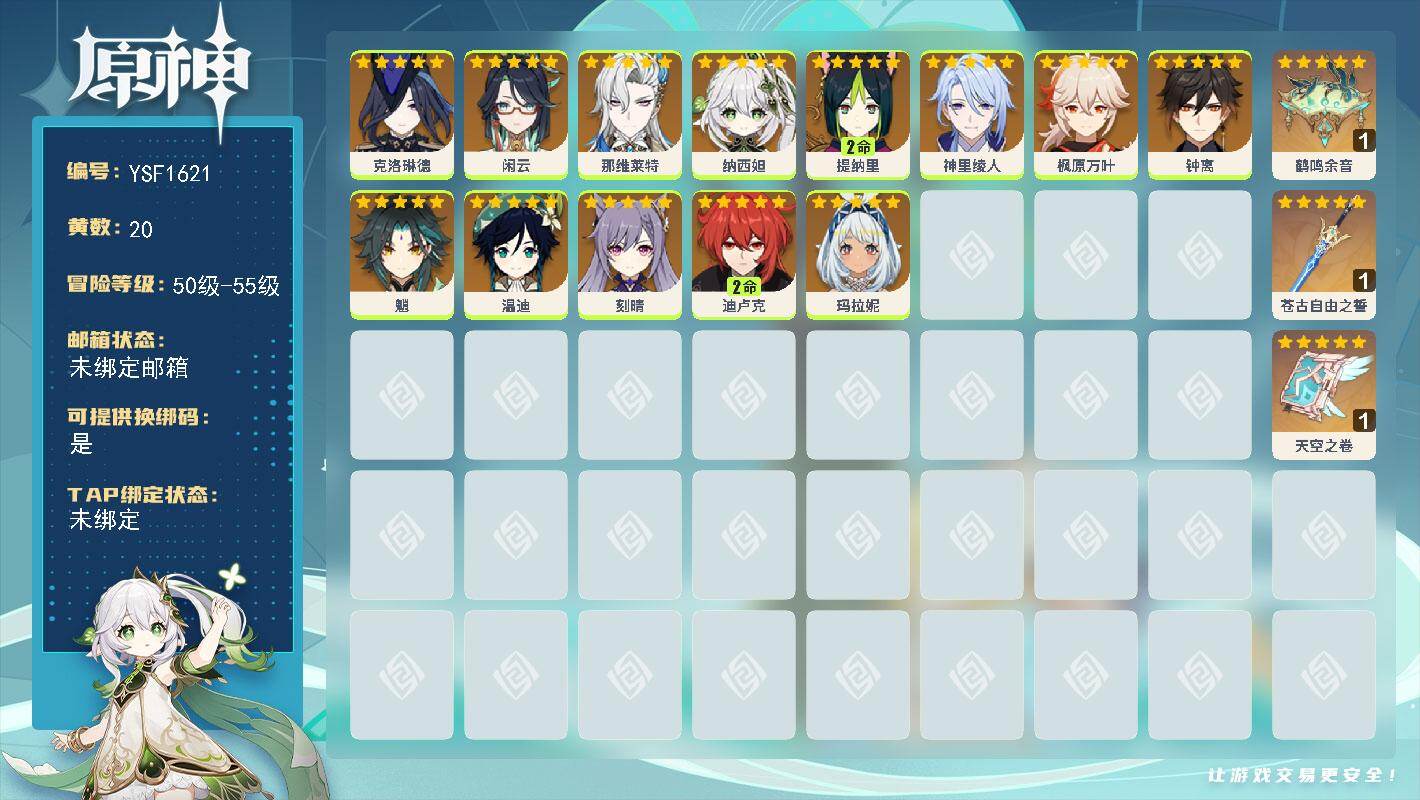 60级/36黄/女主/19个五星角色/8个五星武器/纳西妲