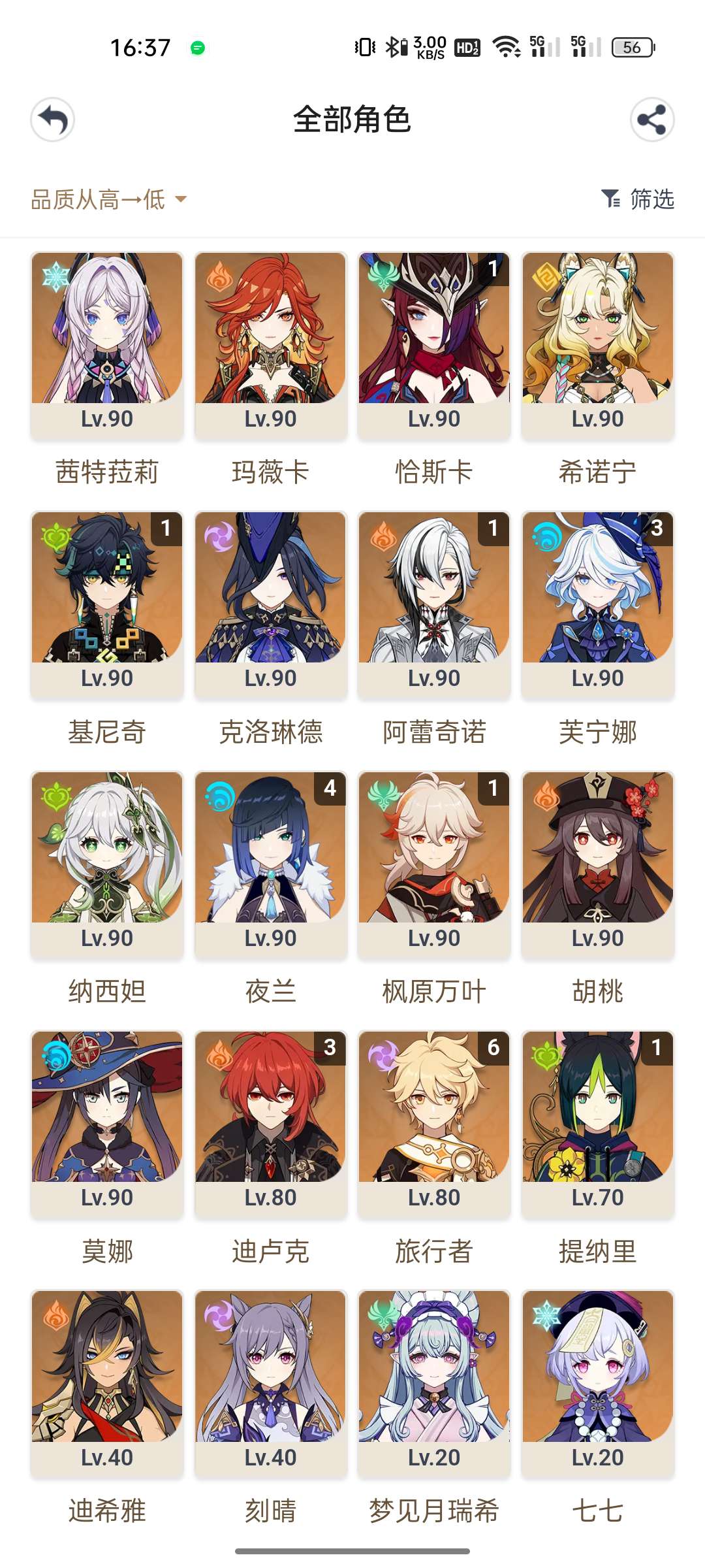 57级/23黄/女主/15个五星角色/5个五星武器/魈/枫原万叶